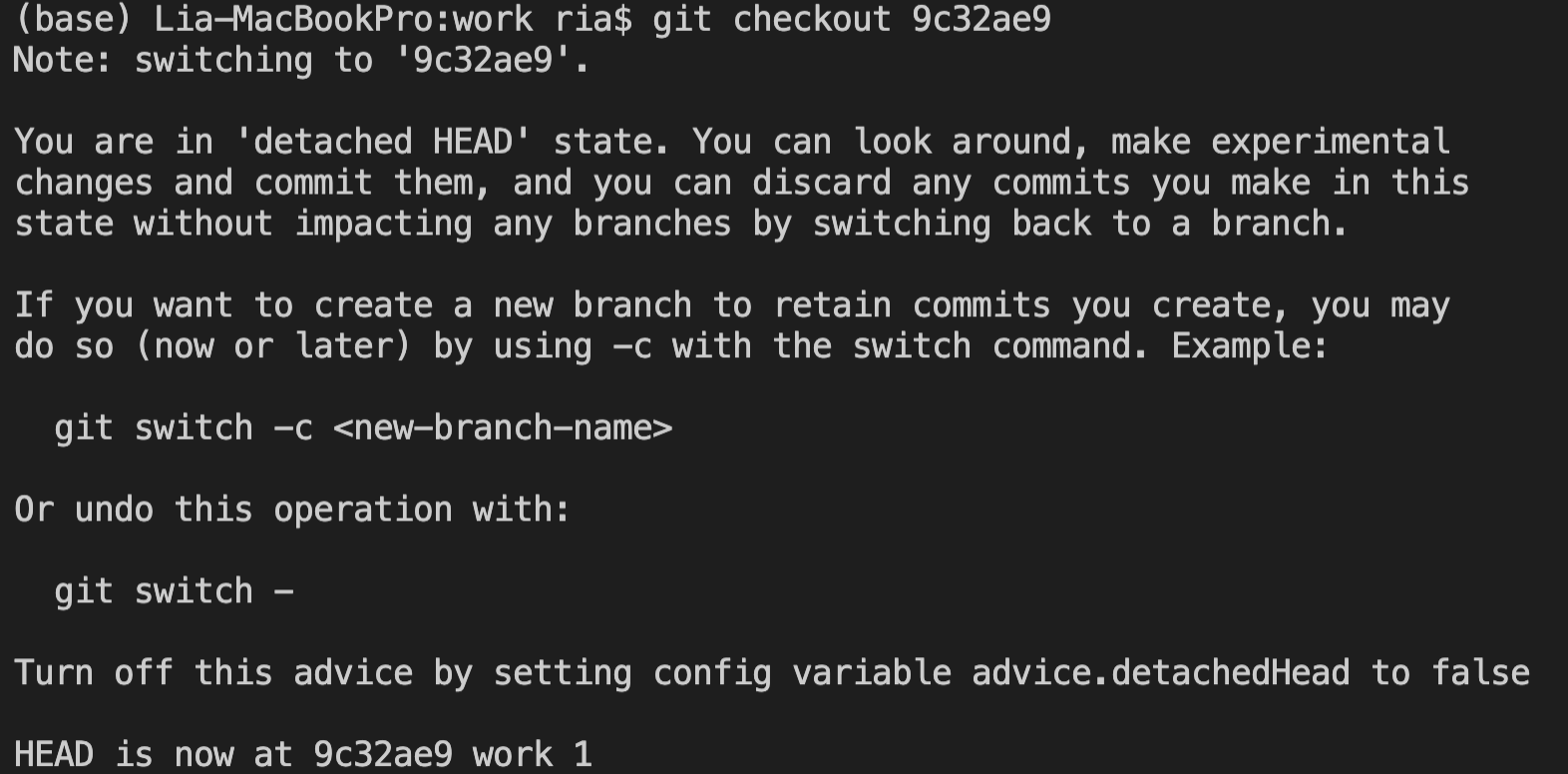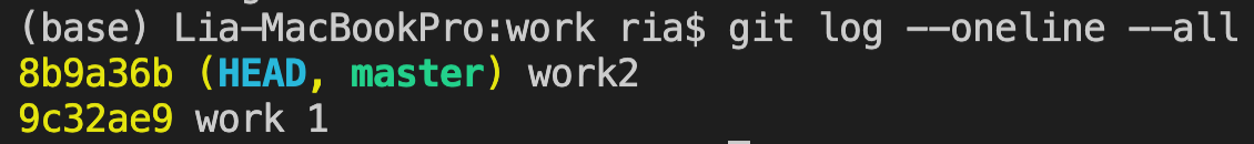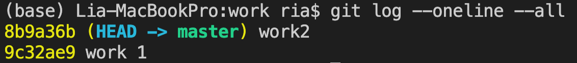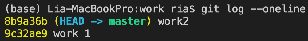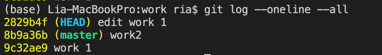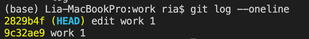 이 뜻은 work1를 커밋한 시점으로 돌아간다는 것이고, 내용을 추가한 뒤에 다시 add, commit을 해본다. 이 때 커밋 메시지는 "work 1 edit"이라고 하였다.