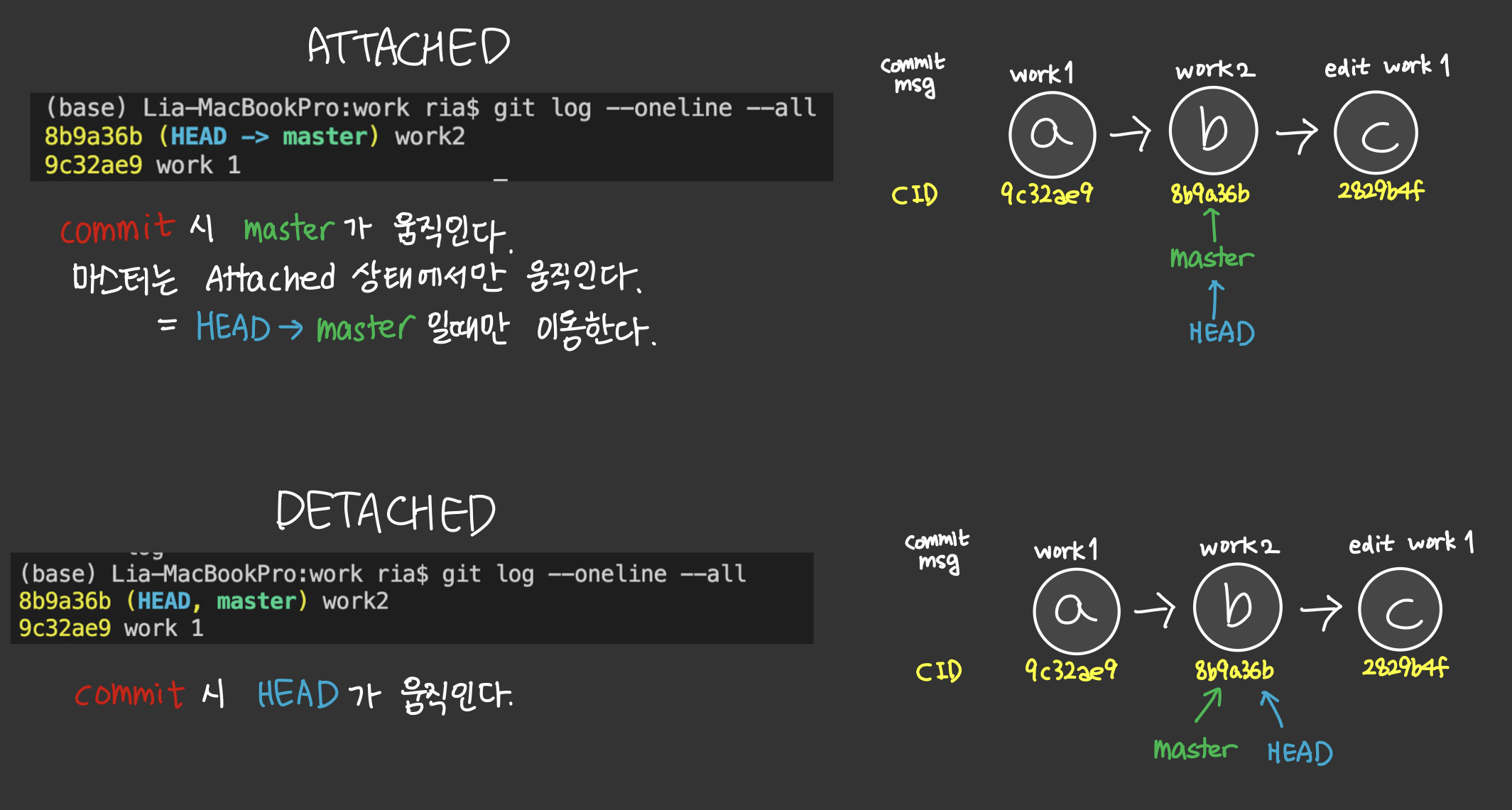 git checkout master 대신 마스터의 CID를 직접 입력하면 아래와 같이 HEAD와 master가 콤마로 구분되는데, 이때 HEAD와 master은 각각 같은 체크포인트를 가리키고 있고, 서로는 연결되어있지 않다.