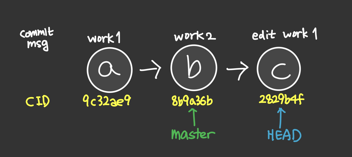 master는 그대로 work2에 있는 것을 알 수 있다. 즉, HEAD가 계속 움직이면서 checkout을 하고 commit을 하기에 master는 영향을 받지 않았다. work 1 또한 고유한 CID를 가지고 잘 보존되어있다.