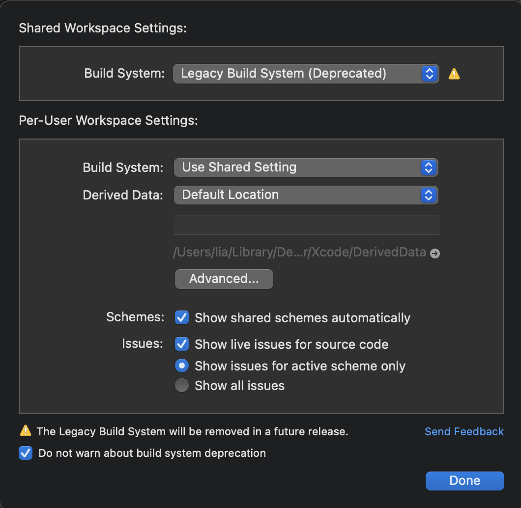 XCode > File > Workspace settings 에 가서 Build System을 Legacy Build System으로 변경한다.