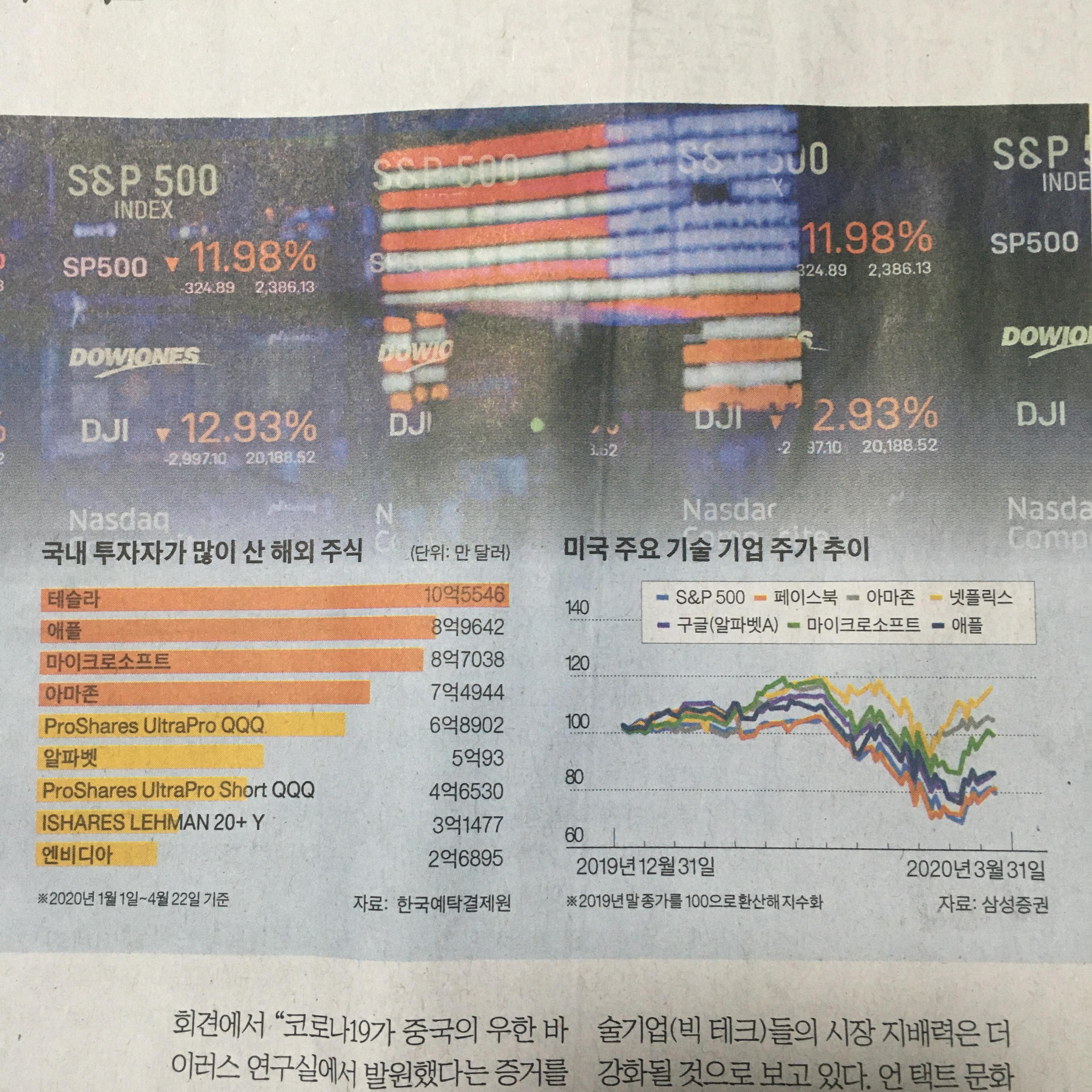 지난 1일 테슬라의 일론 머스크 ceo가 트위터에 "내 생각에 테슬라 주가가 너무 높다"고 띄우자 불과 1시간만에 주가가 10.8%나 곤두박질. 같은 날 트럼프가 코로나19의 책임을 중국에 묻겠다고 하니 미,중 무역갈등이 재연될 조짐 보여 나스닥 지수 3.20% 추락. 서울에선 공휴일 밤 12시에 일어난 일이니 속절없이 당할 수밖에..