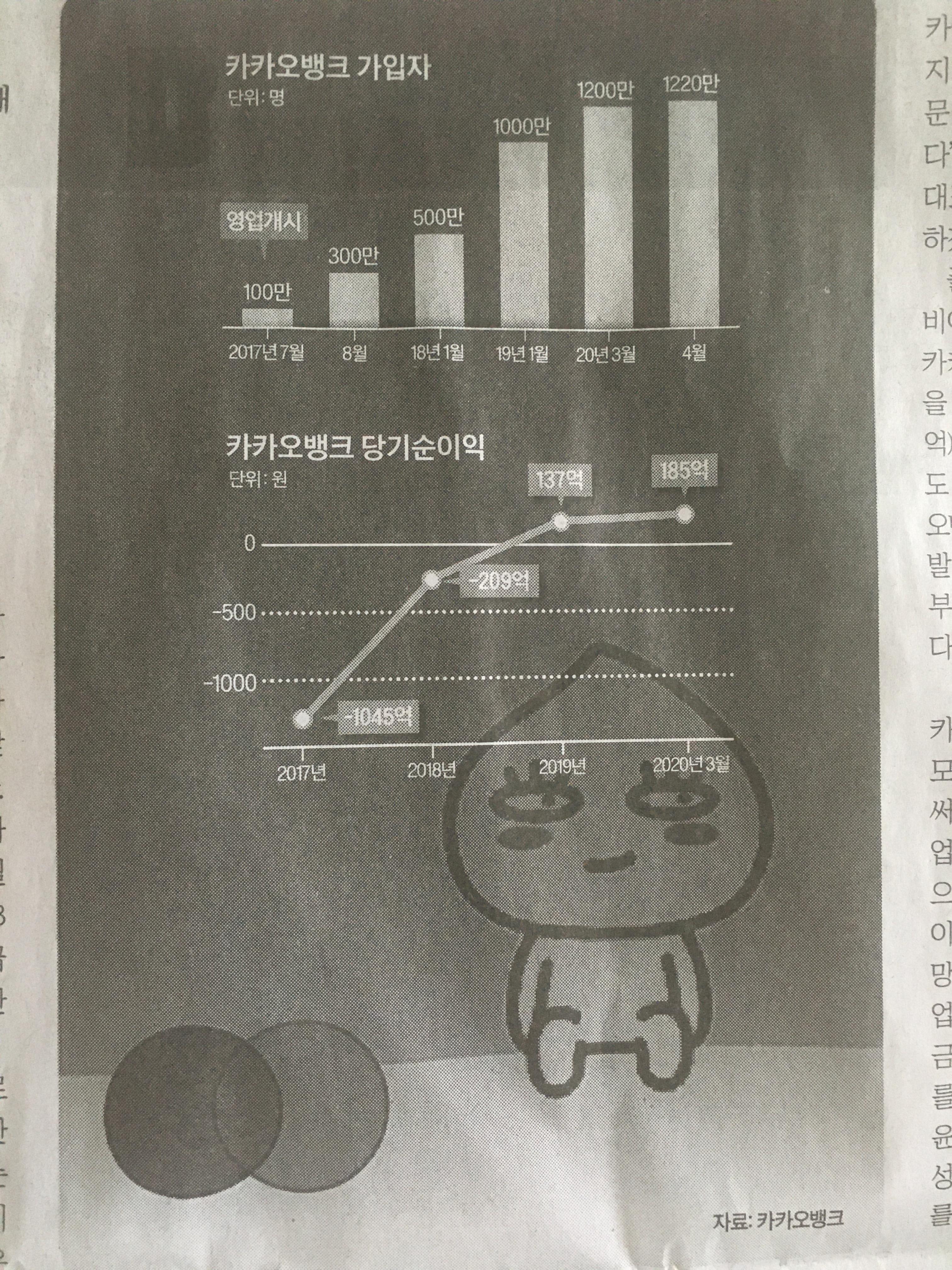 카뱅이 금융권의 메기를 넘어 고래를 노리는 중. 1200만 고객 바탕으로 본격적 돌입. 6일 실적발표를 통해 2020 1분기 당기순이익으로 185억원 기록했다 밝혀. 전년 등기보다 당기순이익 181.3% 증가. 2017년 출범.