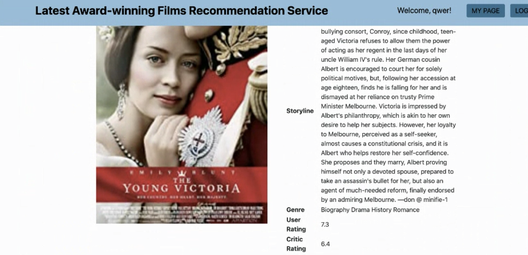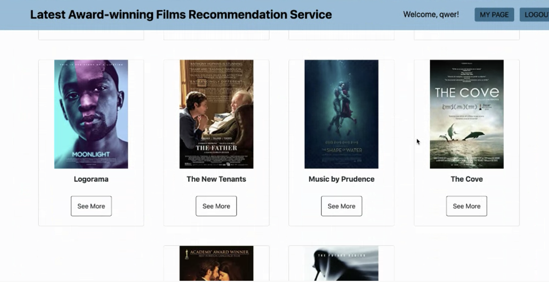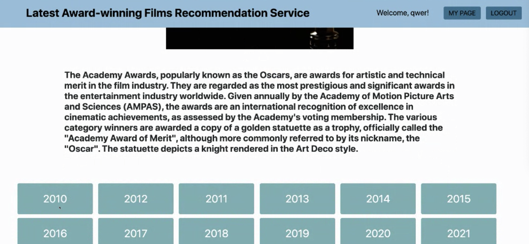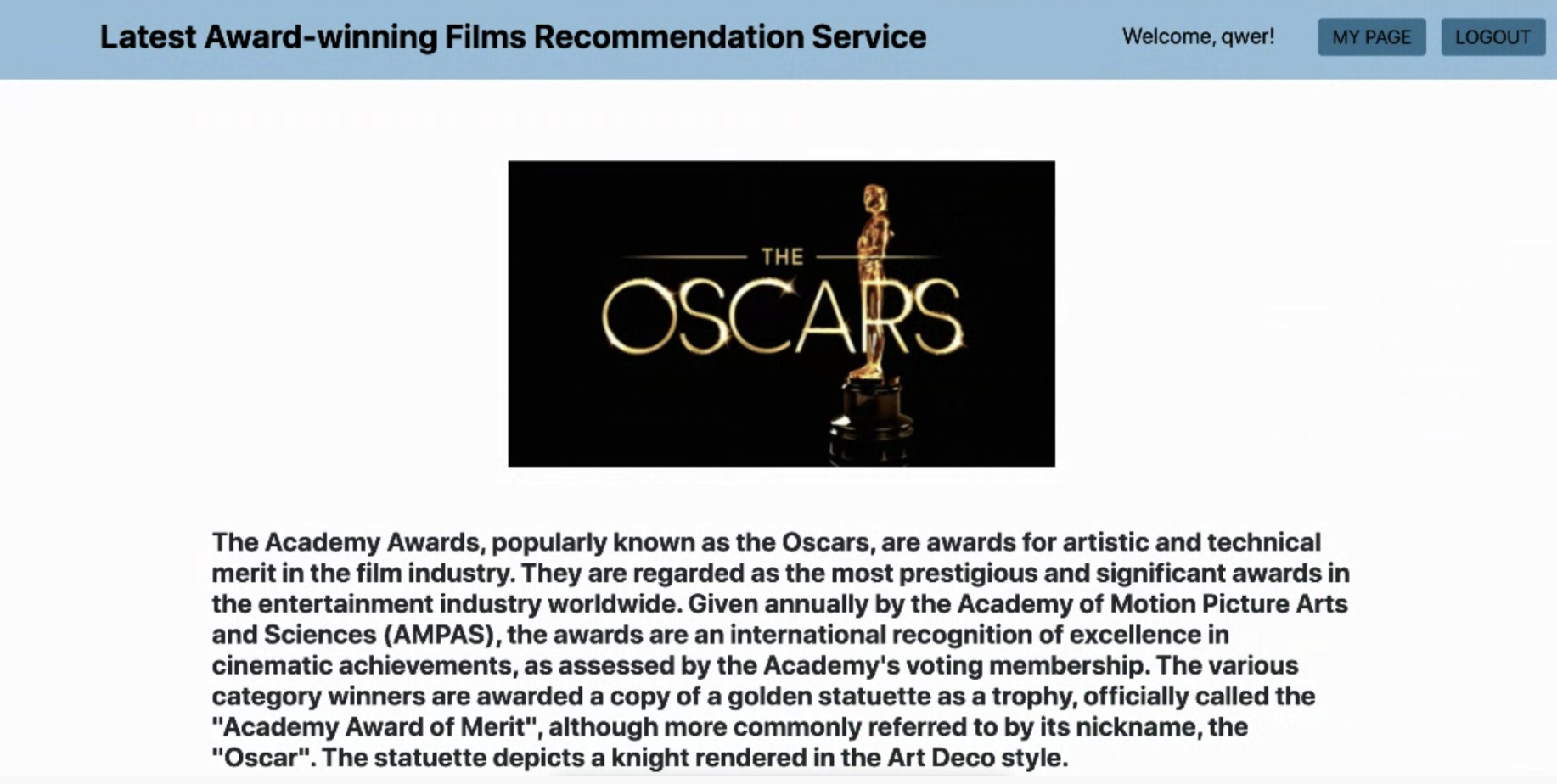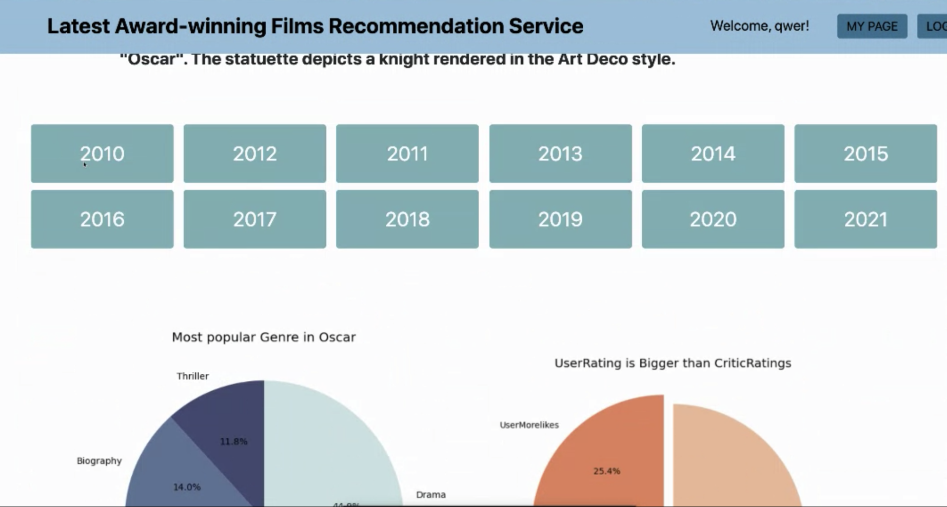 해외 영화제 수상작 영화 데이터를 분석하여 보여주는 웹 서비스를 제작하였다. 기술스택은 처음에는 React+Django였으나... React+Flask로 바뀌고... 마지막엔 Jinja+Flask로 바뀌었다. 그래서 프론트 구현은 발표 직전 마지막 한시간 정도 전에 달리게 된 것 같고 정말 기본적인 디자인을 구현하고 레이아웃을 변경하고 소스들을 싣고 데이터들을 렌더링했었다. 결과물은 아래와 같다..