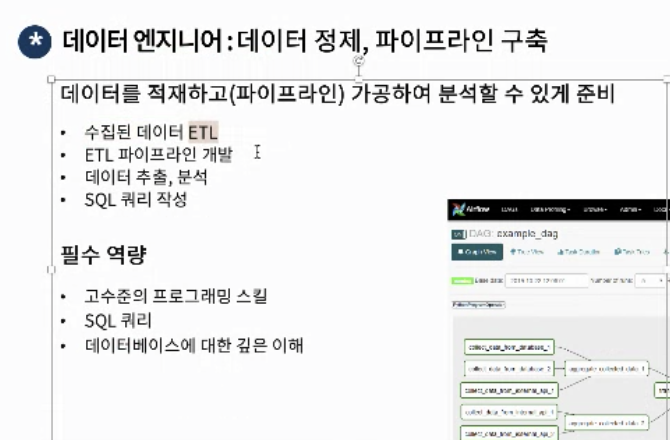 데이터 관련된 직무 자체가 이슈가 된 지 얼마 되지 않았다. 데이터 엔지니어는 분석도 하고 파이프라인도 만들고 인프라 관리도 하고 보는 웹 서버도 개발한다. 메인이 되는 업무는 raw data를 데베에 저장하고, 그 서비스 데베에 저장된 것들을 매일매일 가지고 온다. 플랫폼을 통해 가져와서 sql 쿼리를 만드는 프로그램을 만든다.