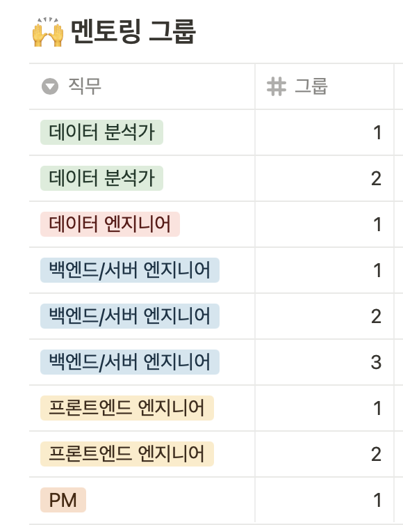 최근에 이루어진 것은 직무멘토링이고, 이는 먼저 직무 멘토링 그룹이 편성되는것으로 시작된다. 엘리스 측에서 제공하는 구글 폼에 대한 답을 하면, 운영진 및 매니저님들이 자기가 작성한 답변을 토대로 워크시트에서 선택한 희망직무 1,2순위에 따라 편성된다.