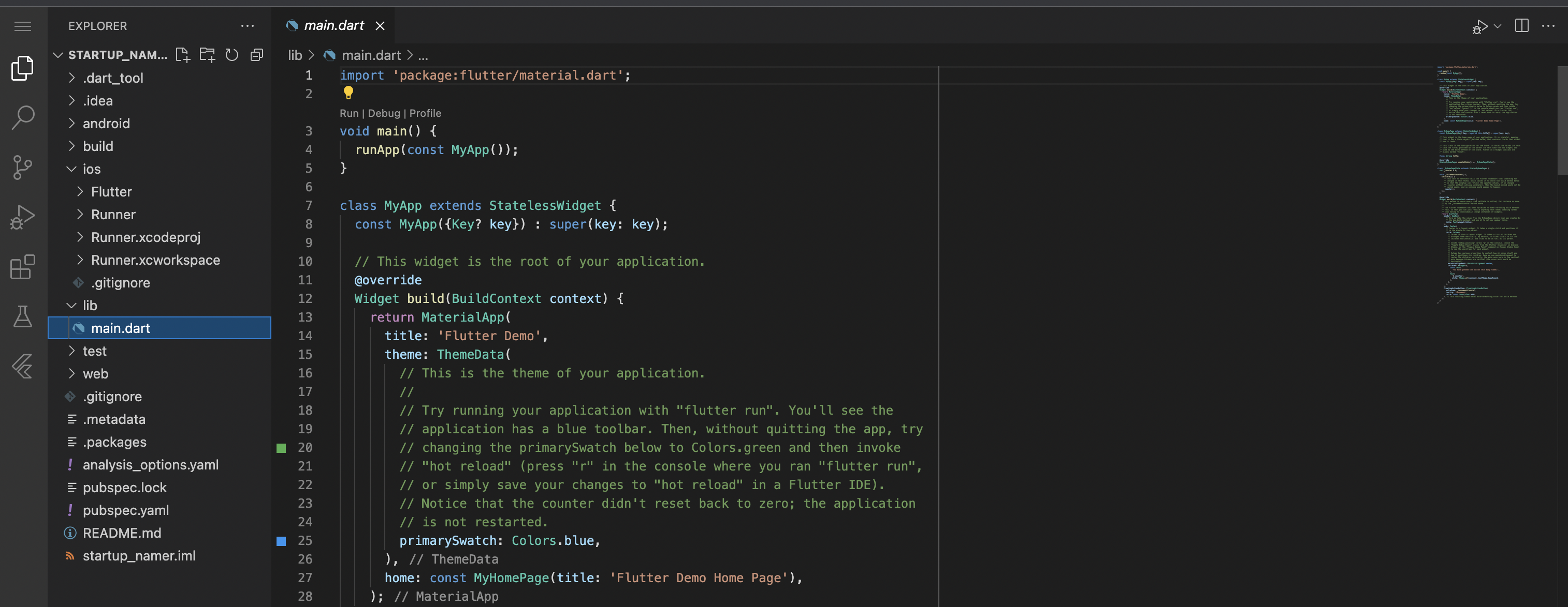 그리고 해당 프로젝트를 열어서 코드를 좀 탐색해볼거다. 특히 ```lib/main.dart``` 과, ```pubspec.yaml``` 파일들을 잘 둘러본다.