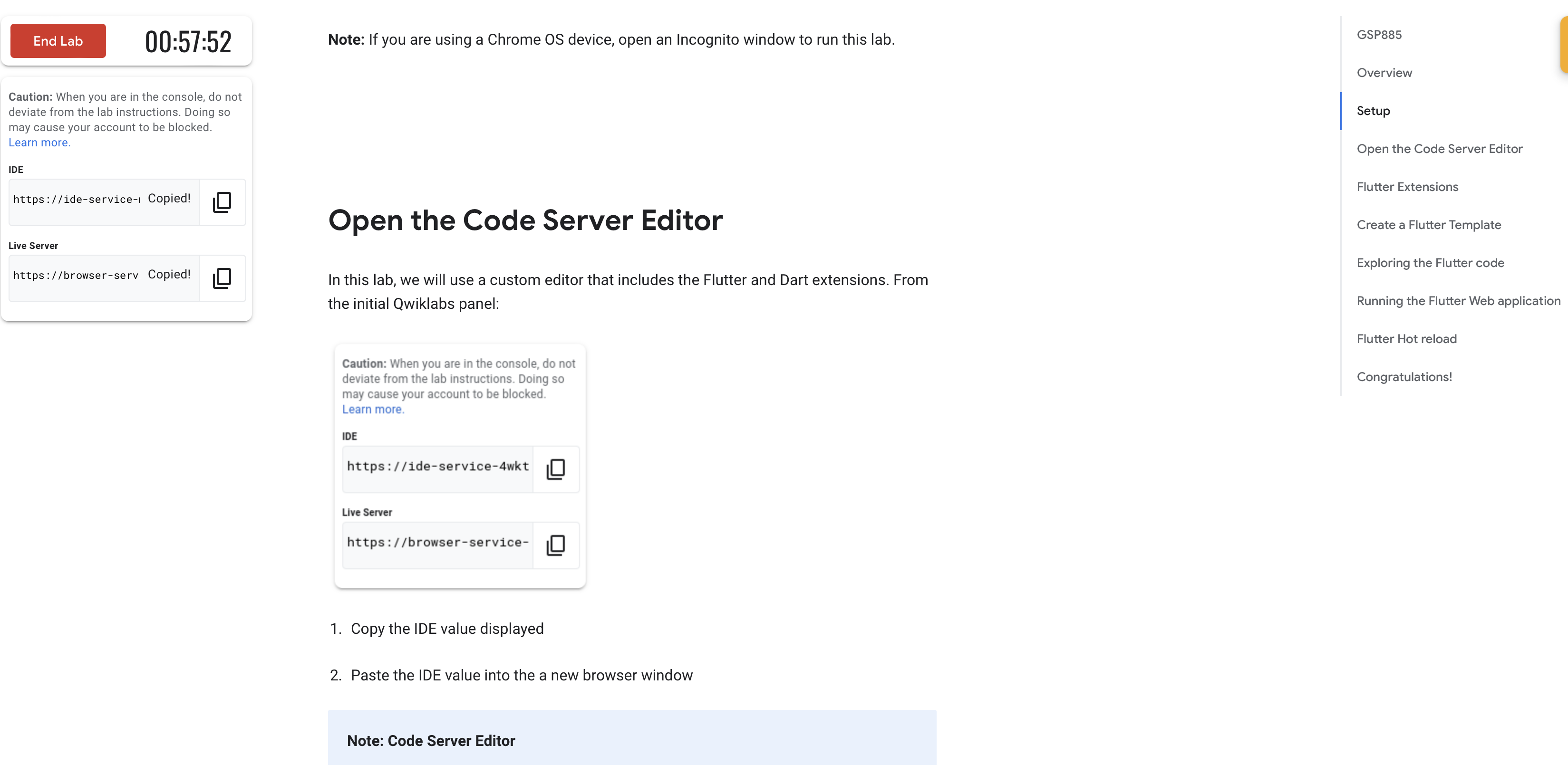 구글에서 제공하는 스터디를 하면, 공부할 때 필요로 할 경우 구글에서는 left pane에 그 스터디에 해당하는 credit ID들을 제공한다. 이 크레딧들은 해당 스터디에 따라 바뀐다. 이메일과 비번이 될 수도 있고, 링크가 될 수도 있고 뭐 그런 식이다. 오늘의 주제인 플러터를 공부하기 위해서는 IDE와 Live Server가 필요한가보다. 메인 페이지에 안내되는 튜토리얼대로 left pane의 개인용 크레딧을 복붙하여 쓰면서 튜토리얼을 따라가면 된다.