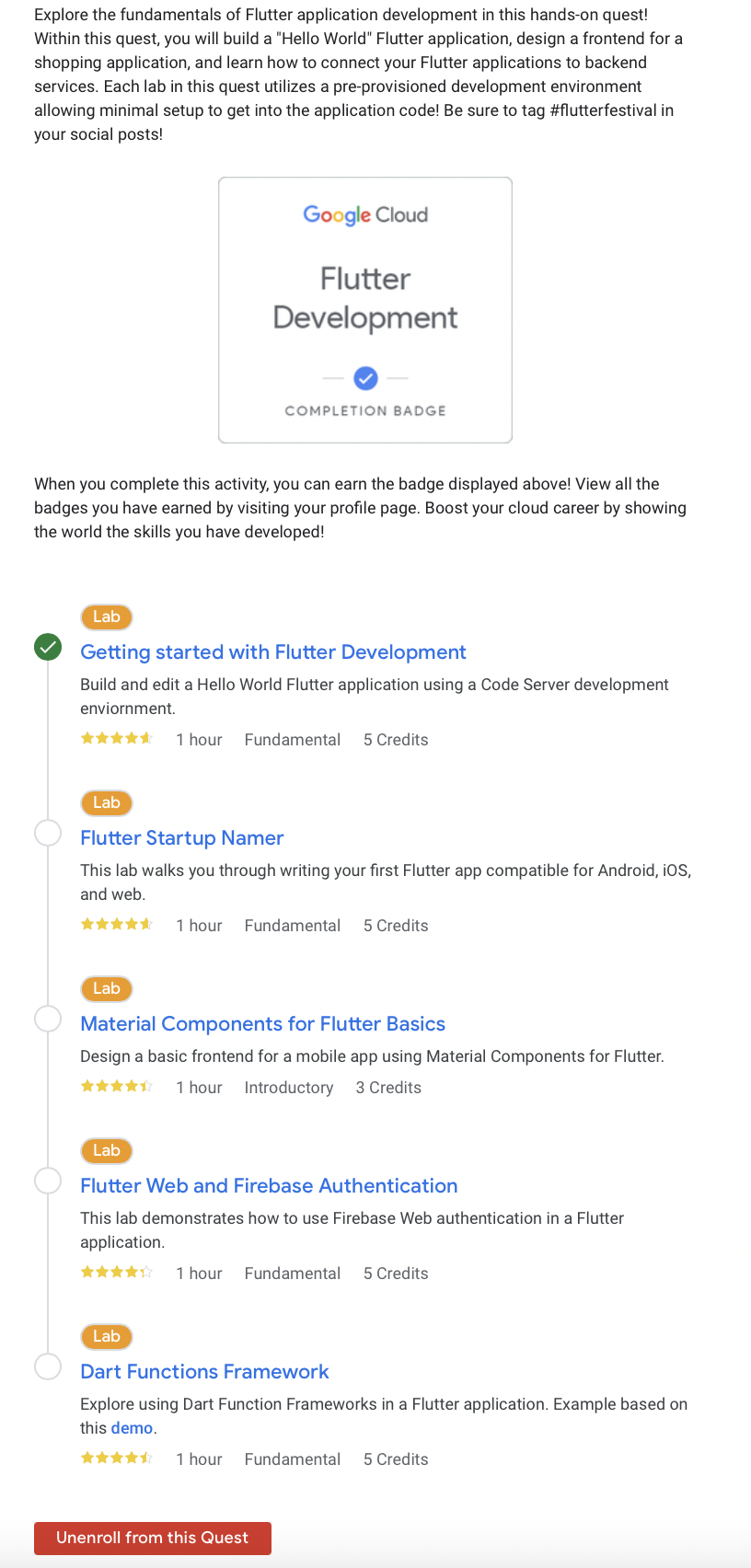 제일 처음 해보고 싶었던 것은 플러터 공부이다. 그래서 Flutter Development 튜토리얼을 따를것인데, 하나의 스터디 주제 아래에는 여러개의 랩들로 구성되어있고 이것을 다 완주하면 뱃지를 얻을 수 있다.