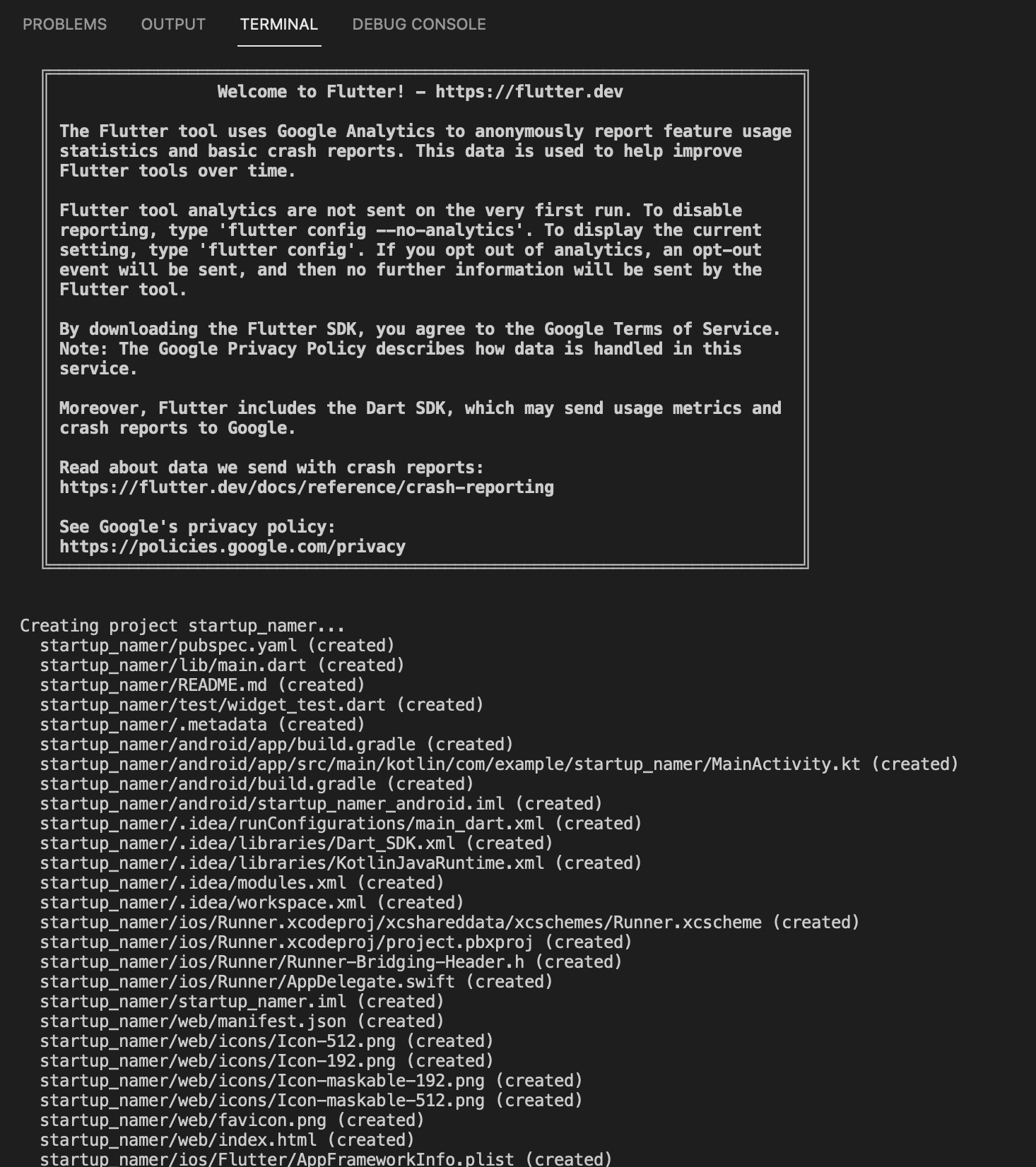 시키는대로 하면 되는데, 일단 모든 언어나 플랫폼을 처음 할 때 하는것처럼 extension에서 flutter 찾아서 설치하고, 터미널을 열어서 flutter create 프로젝트명 이런식으로 입력을 한다. 그러면 아래와 같이 생성완료되었고, 그다음 잘 생성되었는지 디렉터리로 이동 후 exit 한다.
