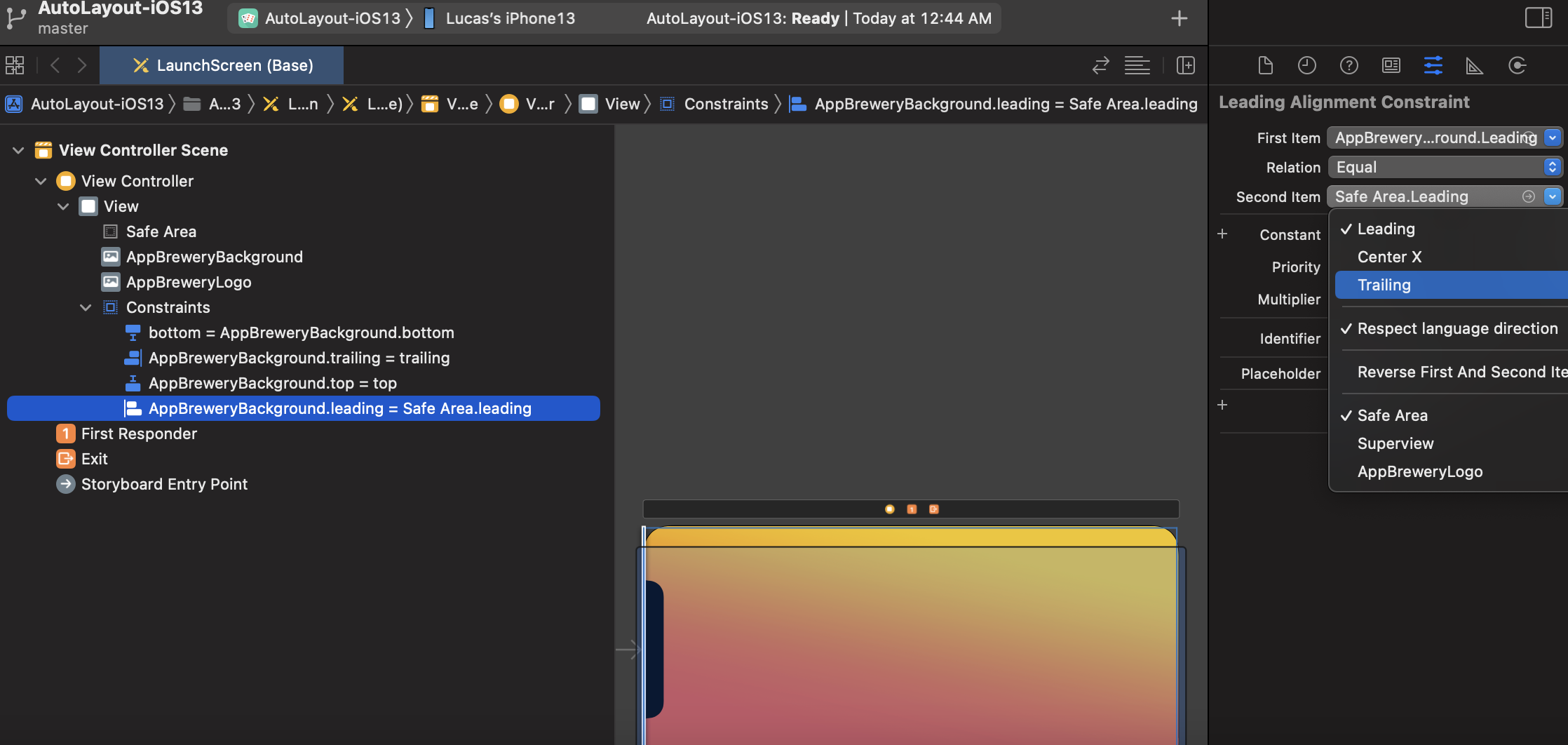 Background 마우스로 선택 후 constraints 설정 -> 오른쪽 attribute inspector에서 Second Item을 Superview로 변경