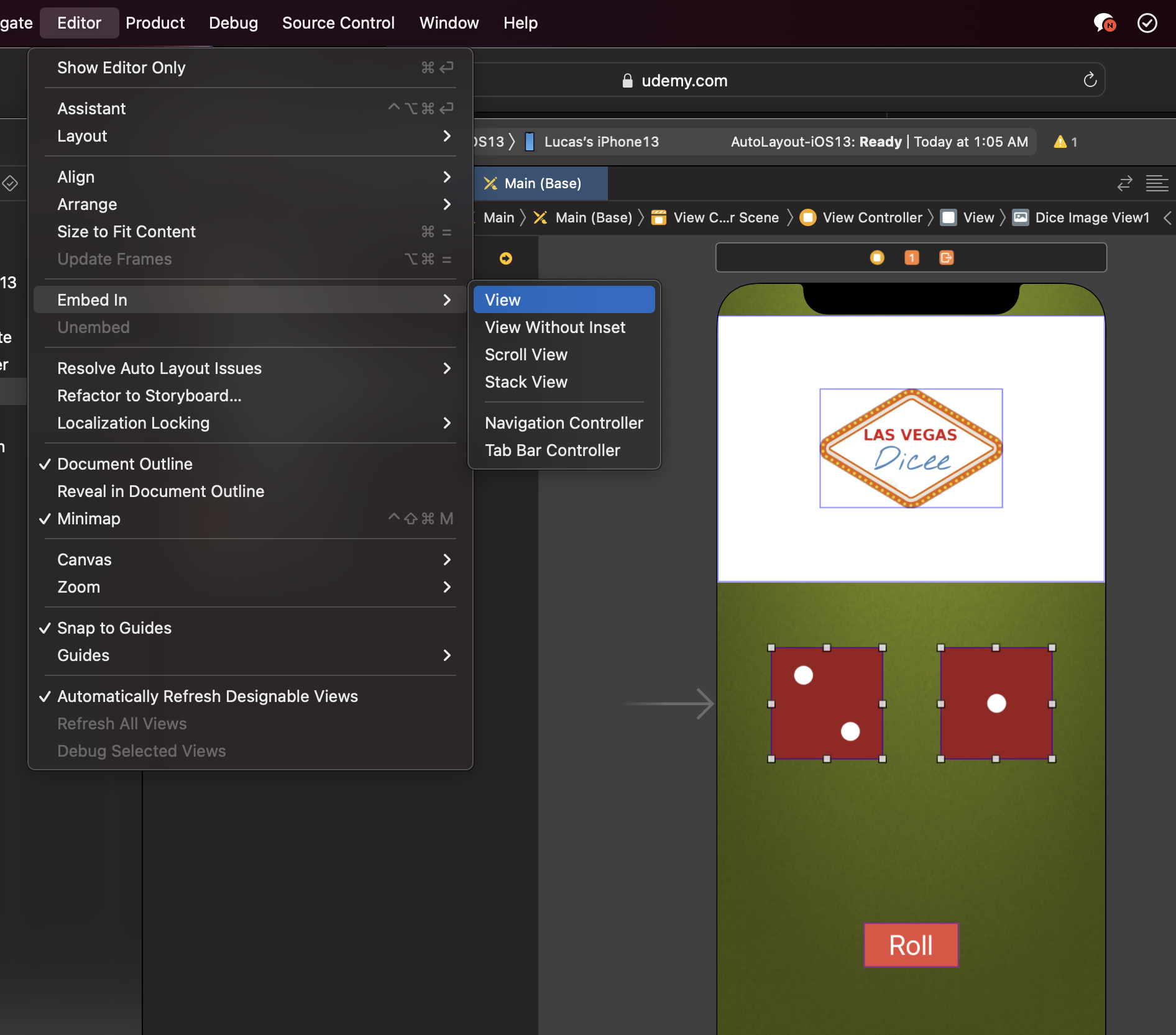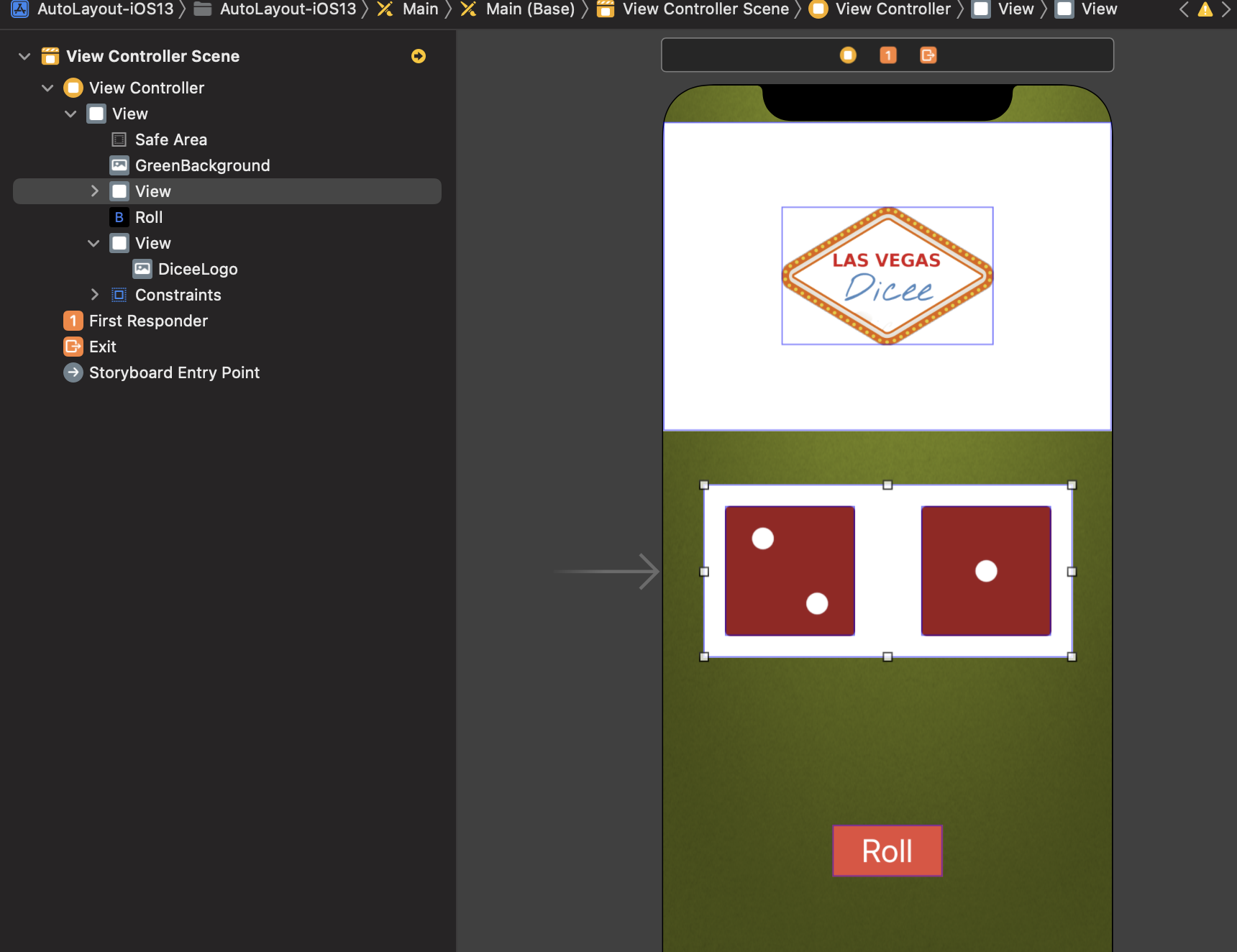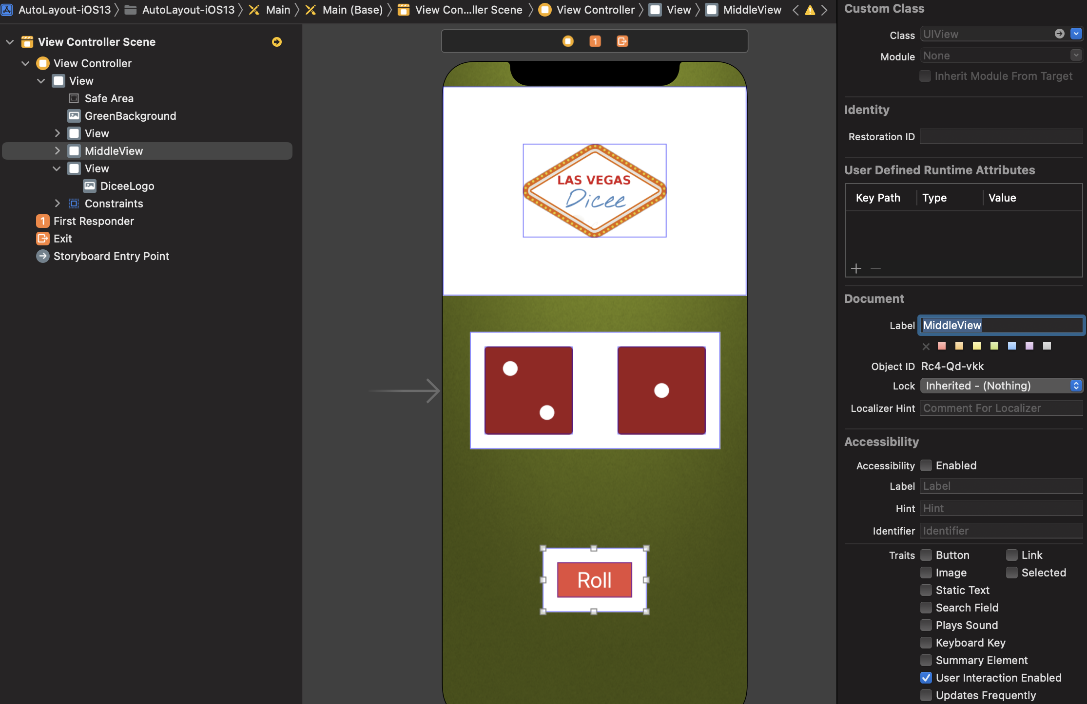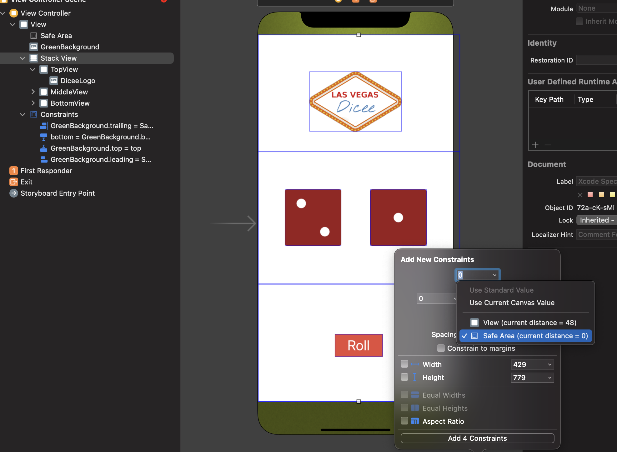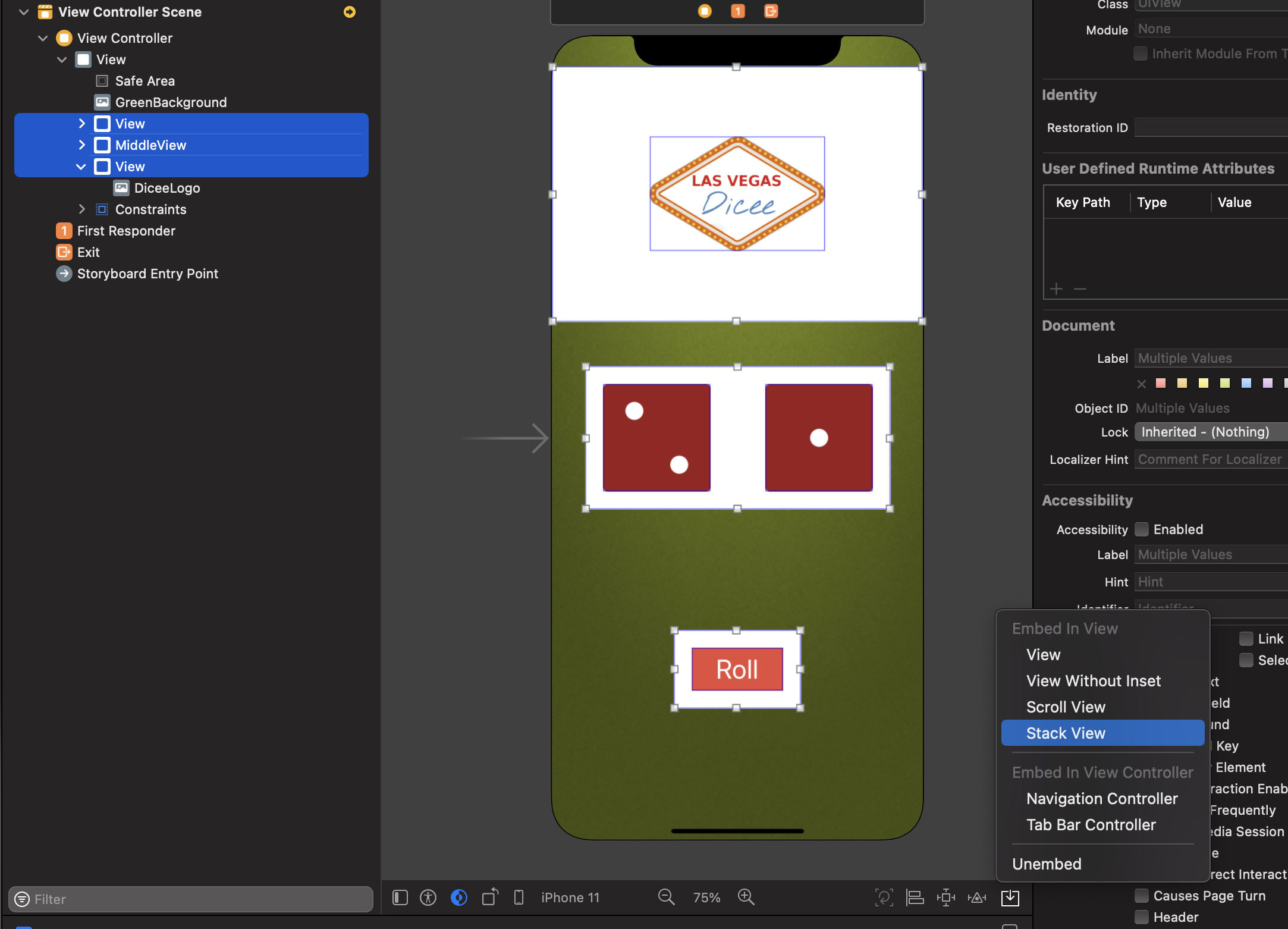 이게 끝났다면 가운데 주사위쪽 컨테이너(가운데 컨테이너)를 왼쪽 메뉴에서 선택 후 편의를 위해 Identity inspector > Document > Label 에서 각 view 마다 이름을 설정해준다.