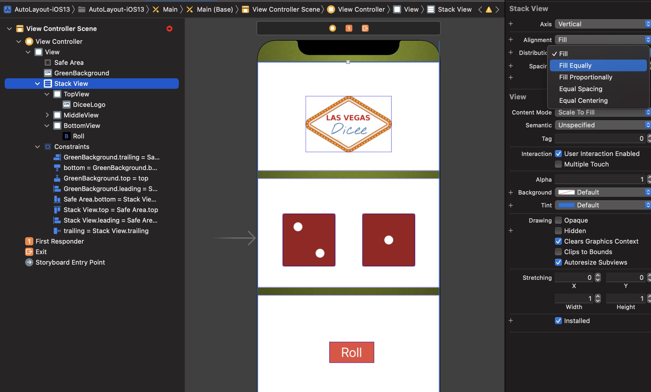 그리고 스택 뷰 선택 후 attributes inspector 에서 distribution: fill equally로 설정