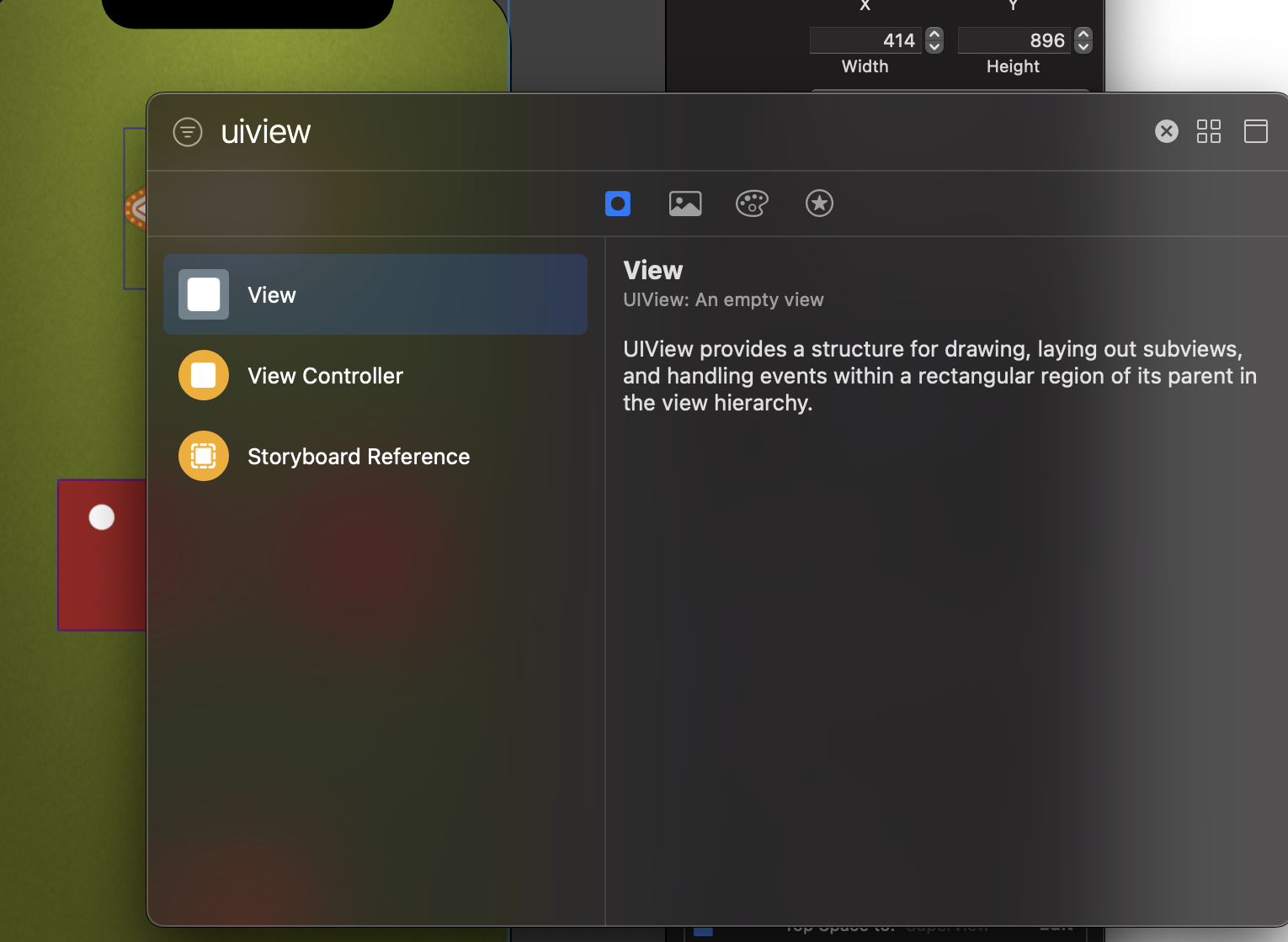 1. 수동으로 컨테이너를 추가하는 방법은 +에서 UIView라고 치면 View 객체가 나오게 된다.