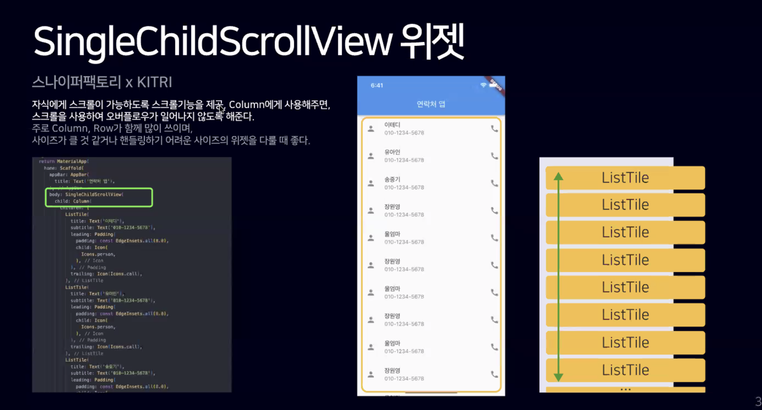 SingleChildScrollView : Column / Row Widget과 함께 쓰임