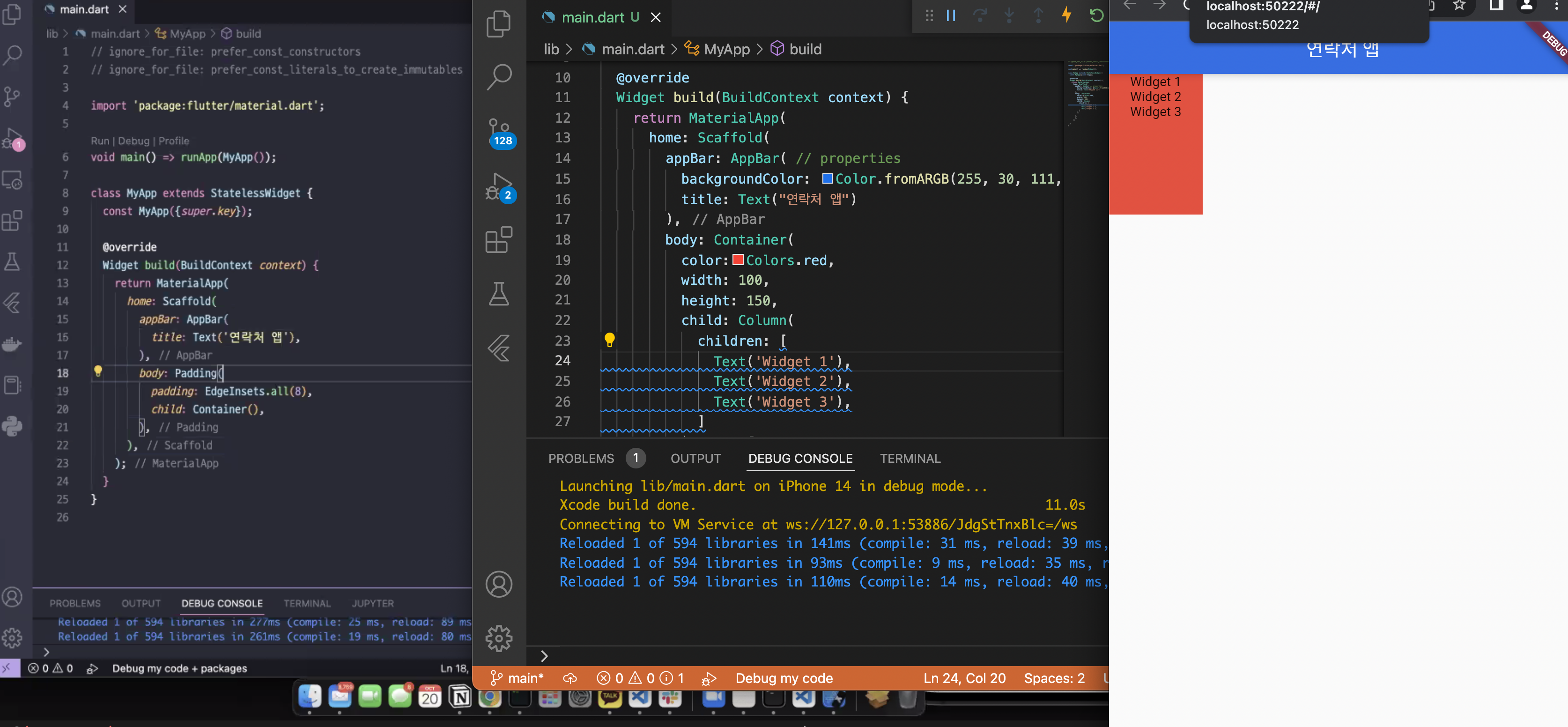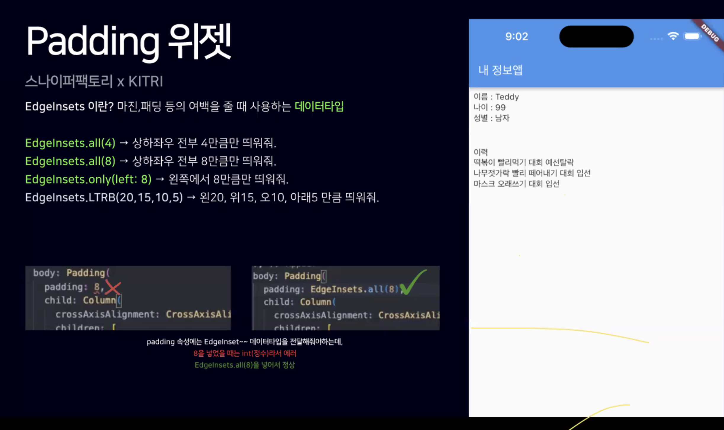 Flutter - 3회차 (widget: Padding, Container, Icon, ListTile, SingleChildScrollView)