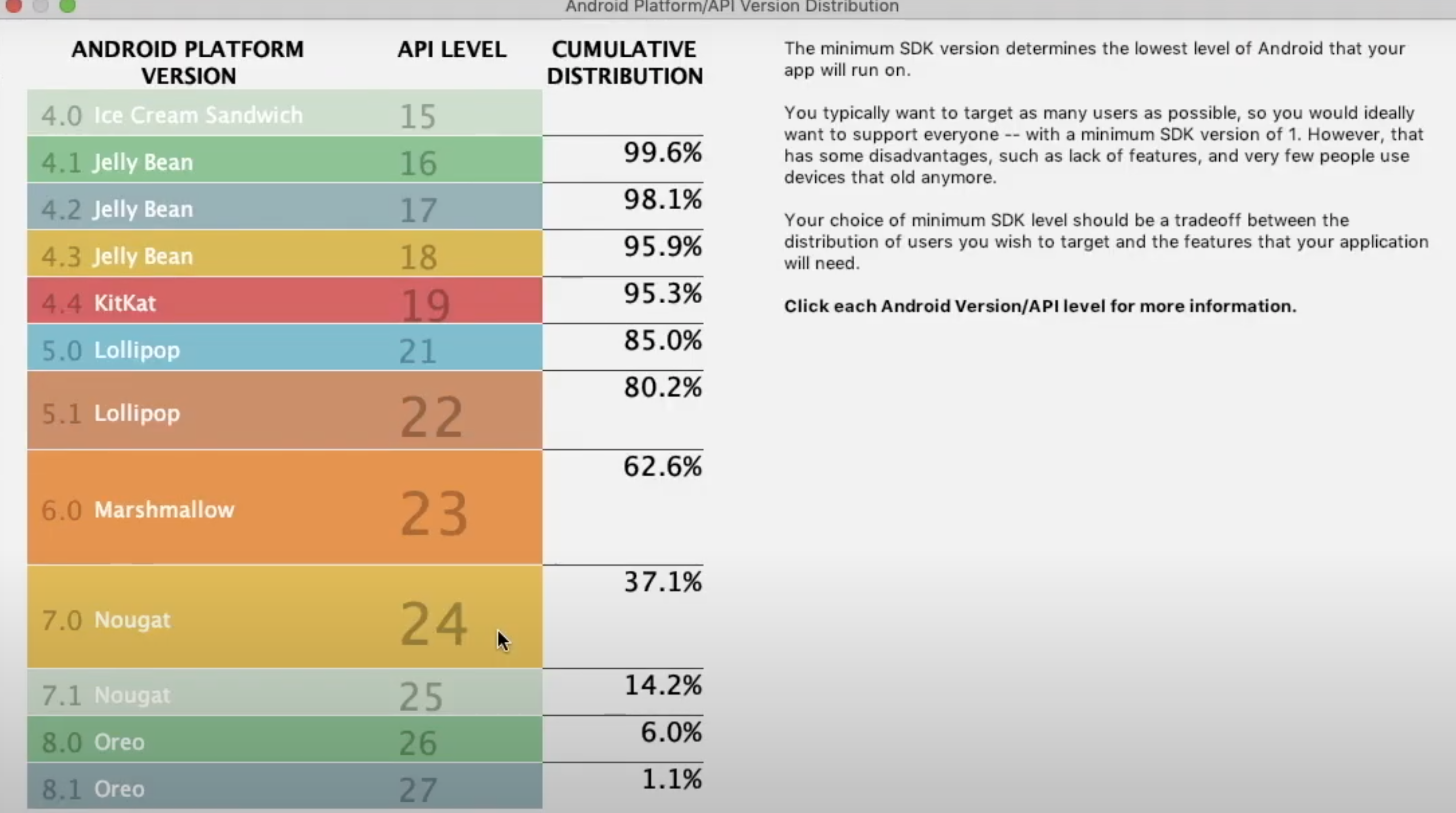 Minimum API Level은 Tradeoff라고 생각하면 된다. 버전이 낮을수록 커버를 할 수 있는 기종은 많고, 버전이 높을수록 다양한 피쳐를 활용할 수 있다.