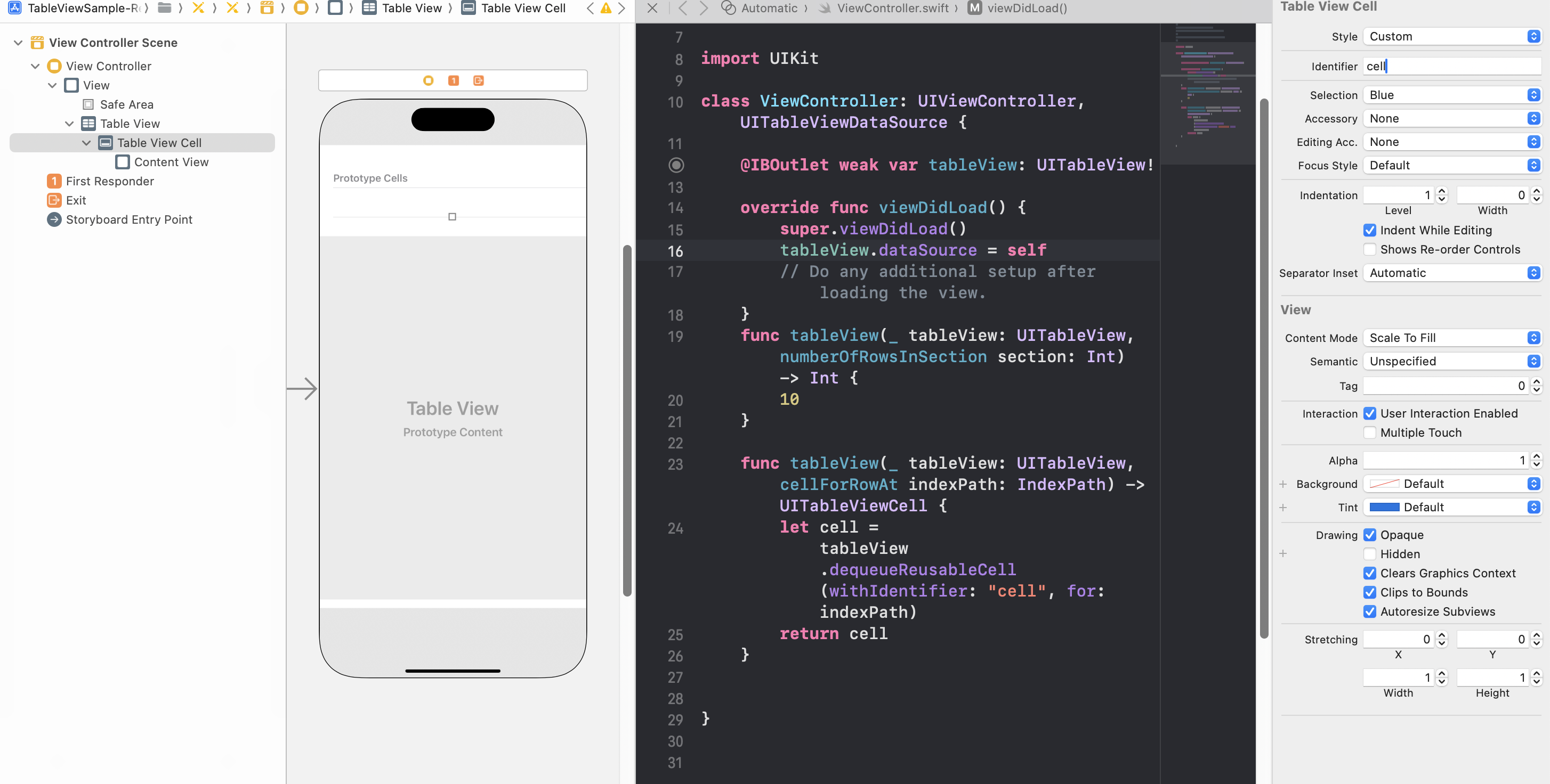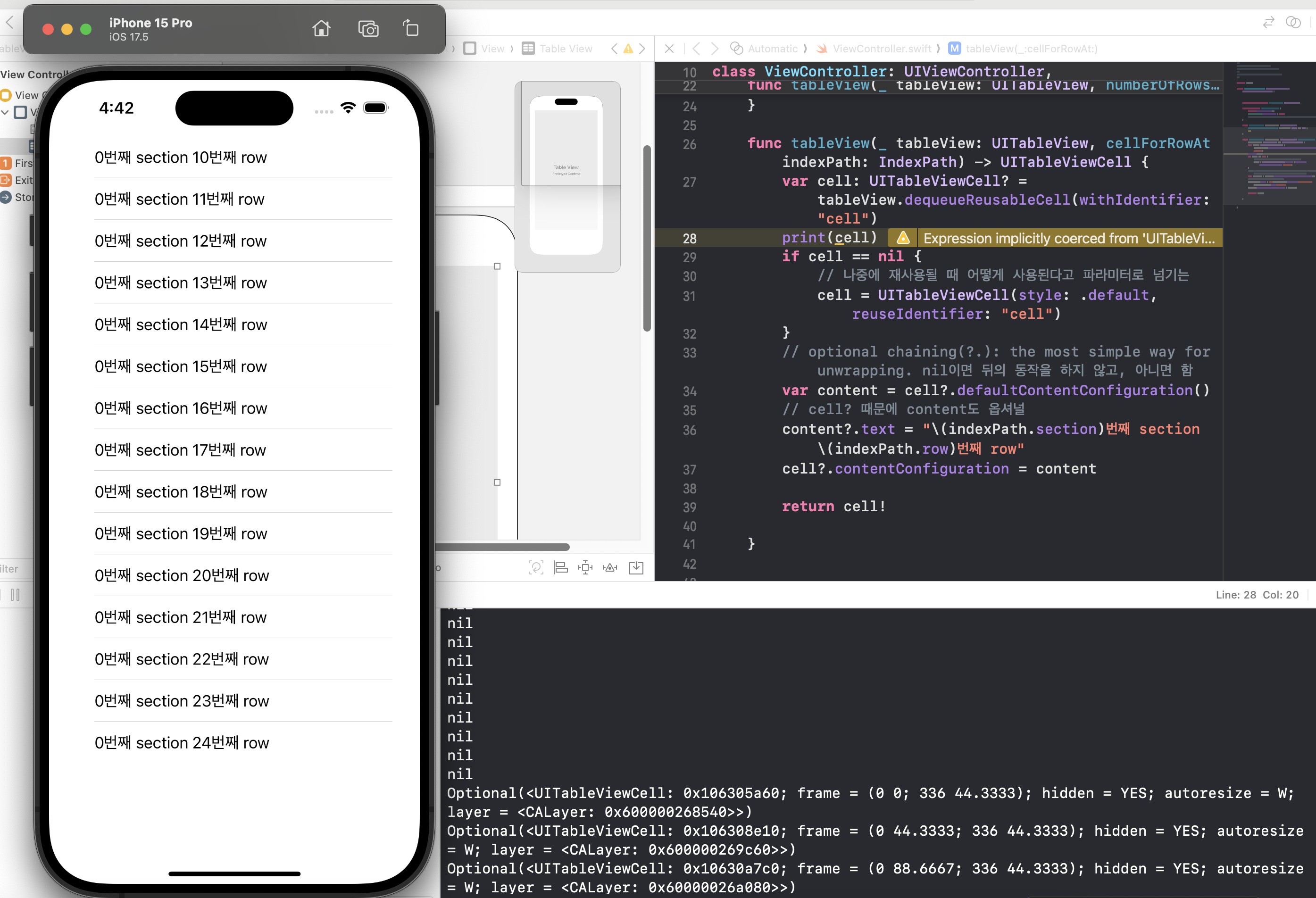 그리고 반드시! Table View Cell이 선택된것을 확인하고선 오른쪽 Identifier에 "cell"이라고 해주어야 맵핑이 된다.
