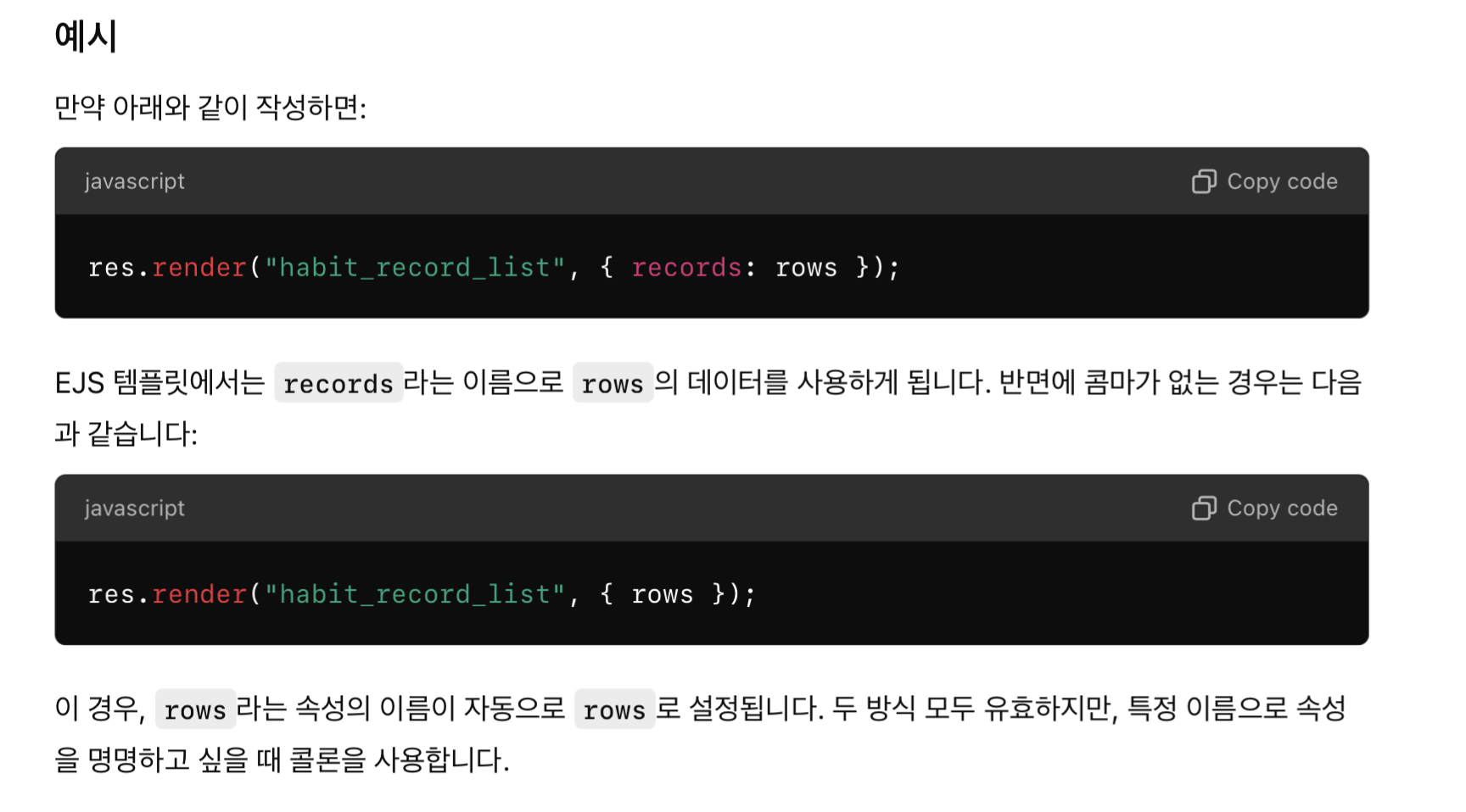 res.render("habit_record_list", { records: rows });에서 콜론(:)은 객체의 속성을 정의하는 방식이다.