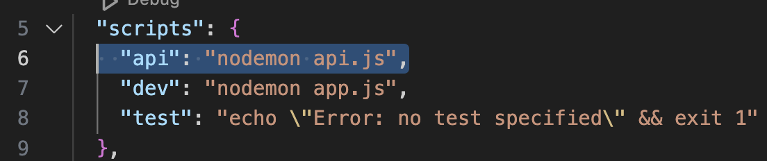아래 line 6("api": "nodemon api.js",)를 새로 입력해준다.