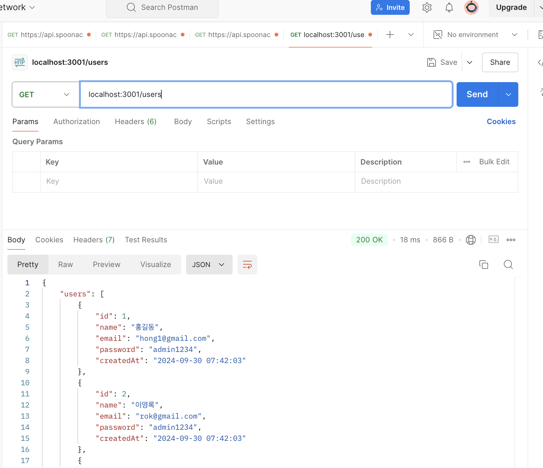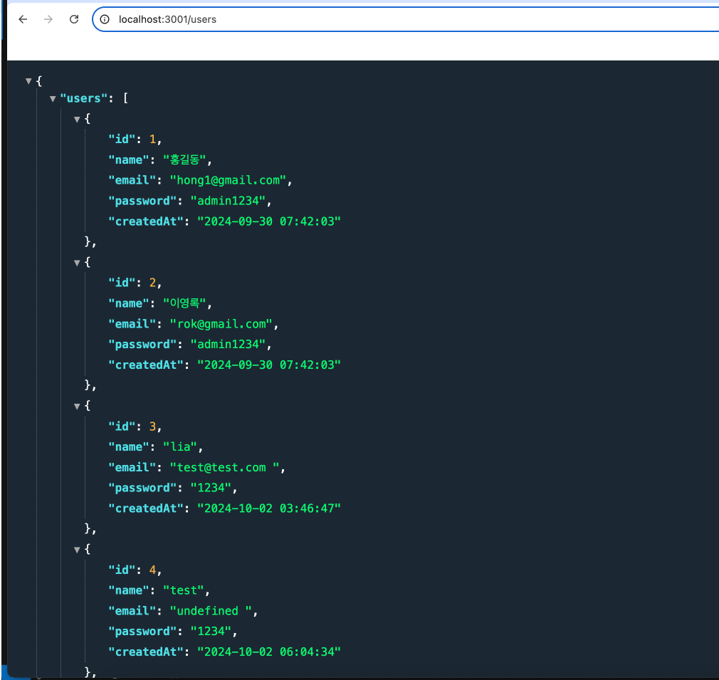작성 후 postman 열고, GET에다가 방금 구현한 주소(http://localhost:3001/users)를 쳐주면 아래와 같이 API처럼 데이터를 잘 가져오는 것을 확인할 수 있다!