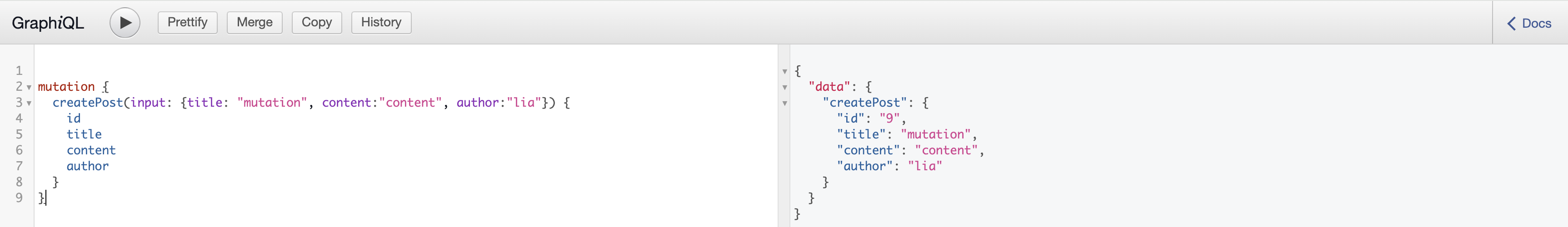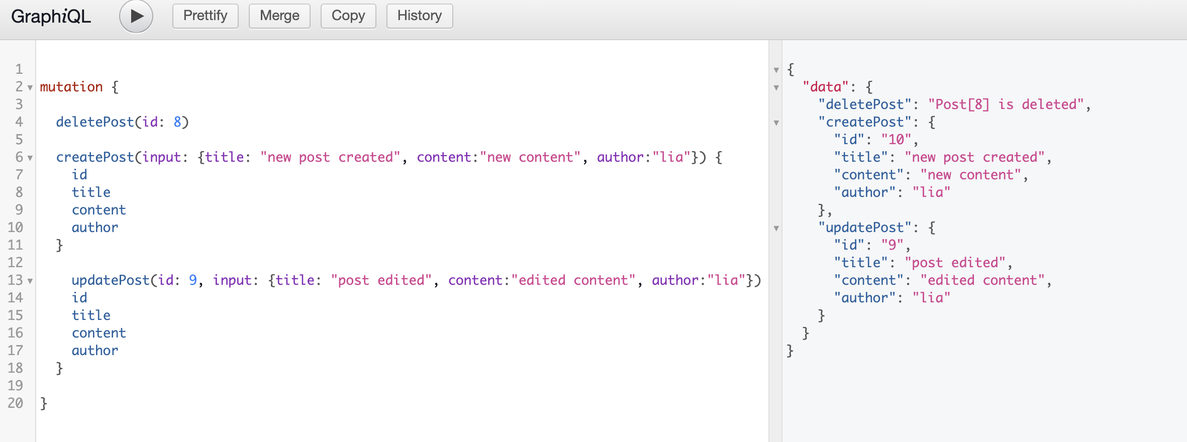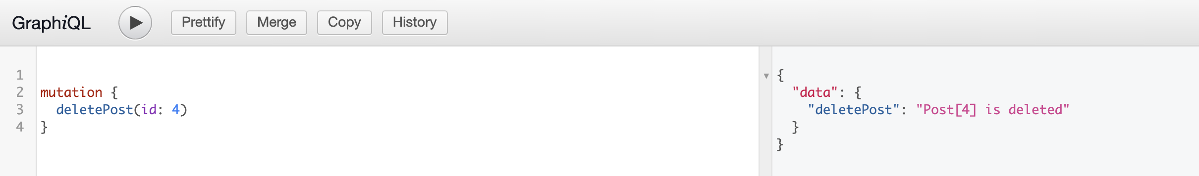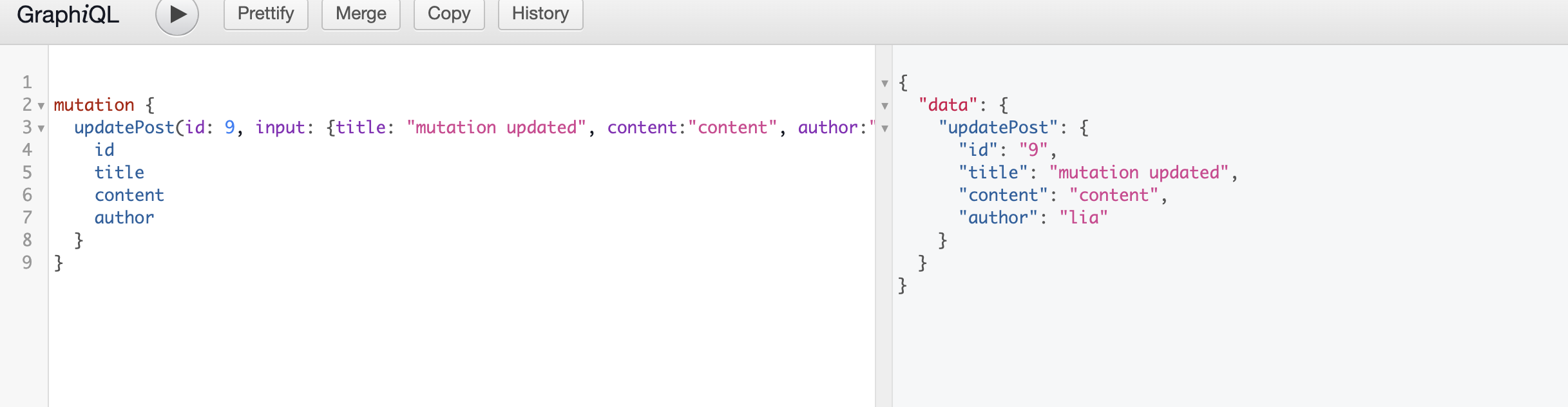 여기서 주의할 점은, GraphiQL에서 쿼리를 날릴 때에는 Mutation으로 정의했더라도 소문자인 mutation으로 날려야 한다는 점이다.