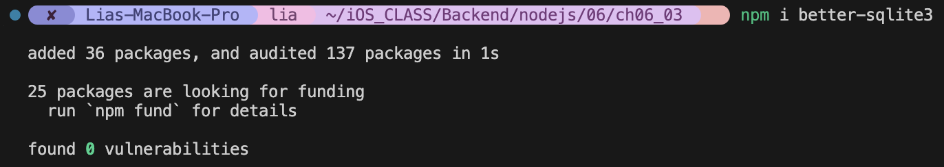 이후 터미널에 npm i better-sqlite3을 쳐서 패키지 설치,