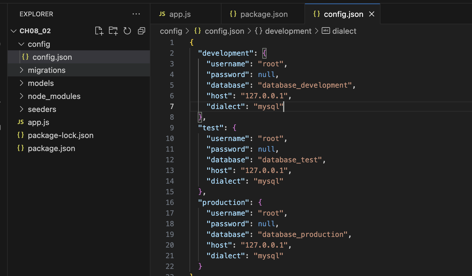 config.json을 열어서 보면 기본 dialect가 "mysql"인것을 볼 수 있다.