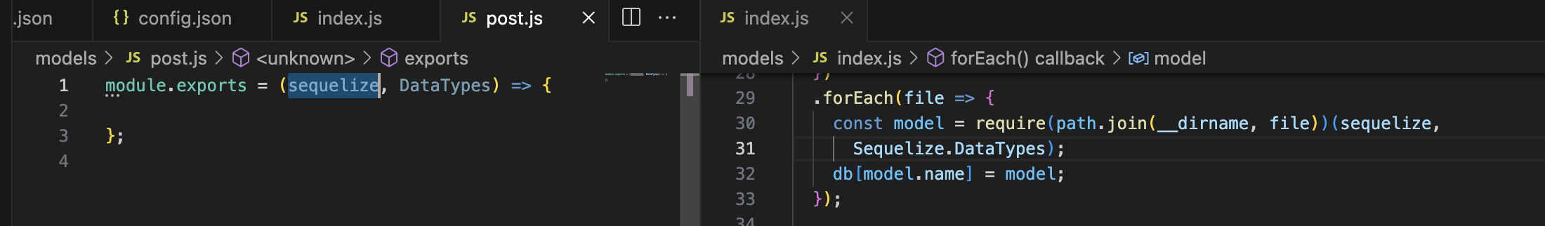 - index.js에서 post.js를 호출하여 Post 모델을 불러오고, 이를 db 객체에 등록함으로써 애플리케이션 내에서 모델을 쉽게 사용할 수 있게 연결된다.