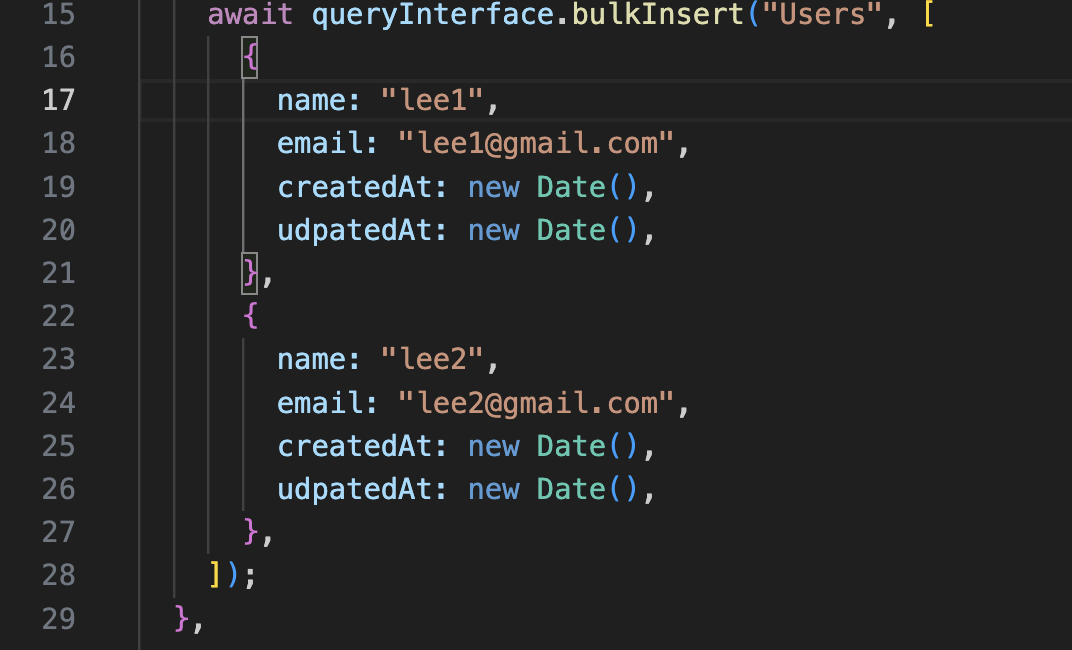 그리고, 20241016062945-demo-user.js 로 가서 async up()안의 주석의 마지막 부분부터 엔터를 쳐서 아래와 같은 코드를 추가해준다.