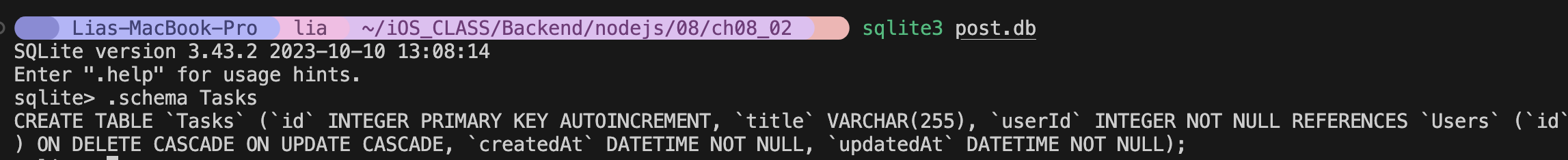 sqlite> .schema Tasks 를 입력해본다. 로그를 보면, 'Users'가 되어야하는데 'User'인 것이 보인다.
