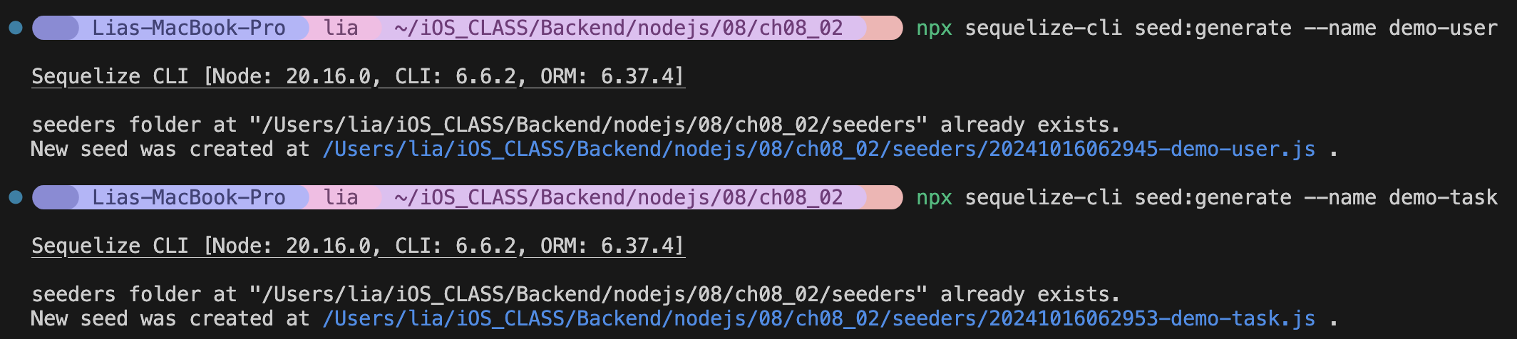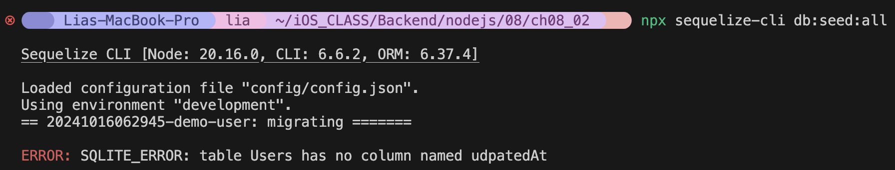 이제 다시 npx sequelize-cli db:seed:all 를 입력한다.