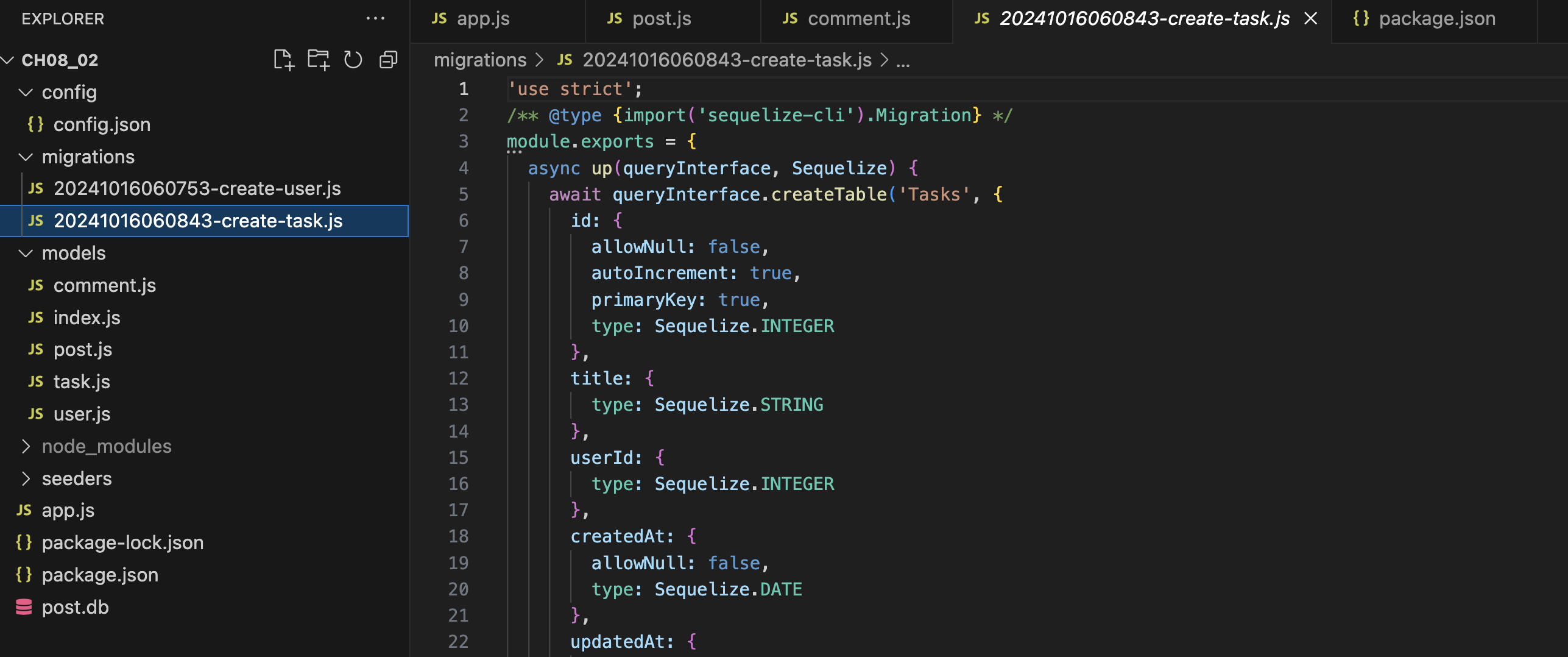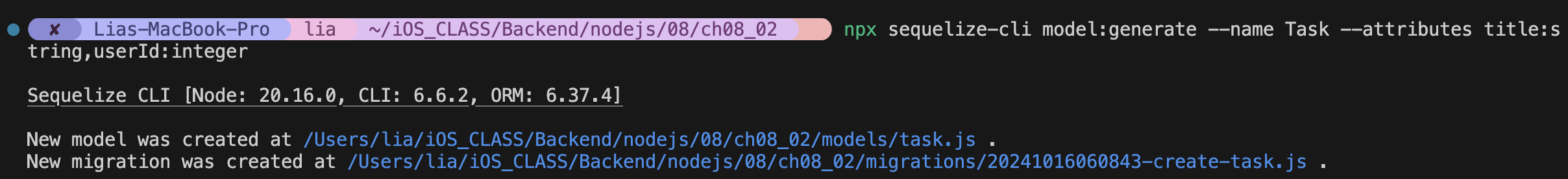 npx sequelize-cli model:generate --name Task --attributes title:string,userId:integer