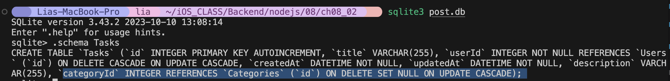 sqlite3로 확인을 해본다. 추가된 것 확인