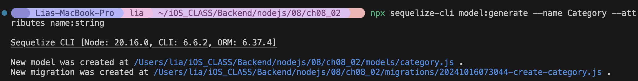 npx sequelize-cli model:generate --name Category --attributes name:string