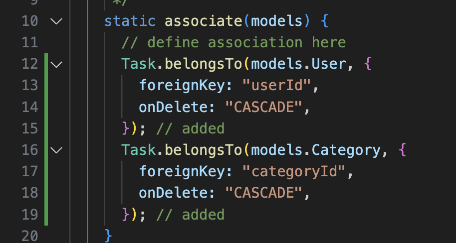 이제, models > task.js 에 가서 associate(models) {} 안에 추가를 해준다. (이전 포스팅에선 안해서 한꺼번에)
