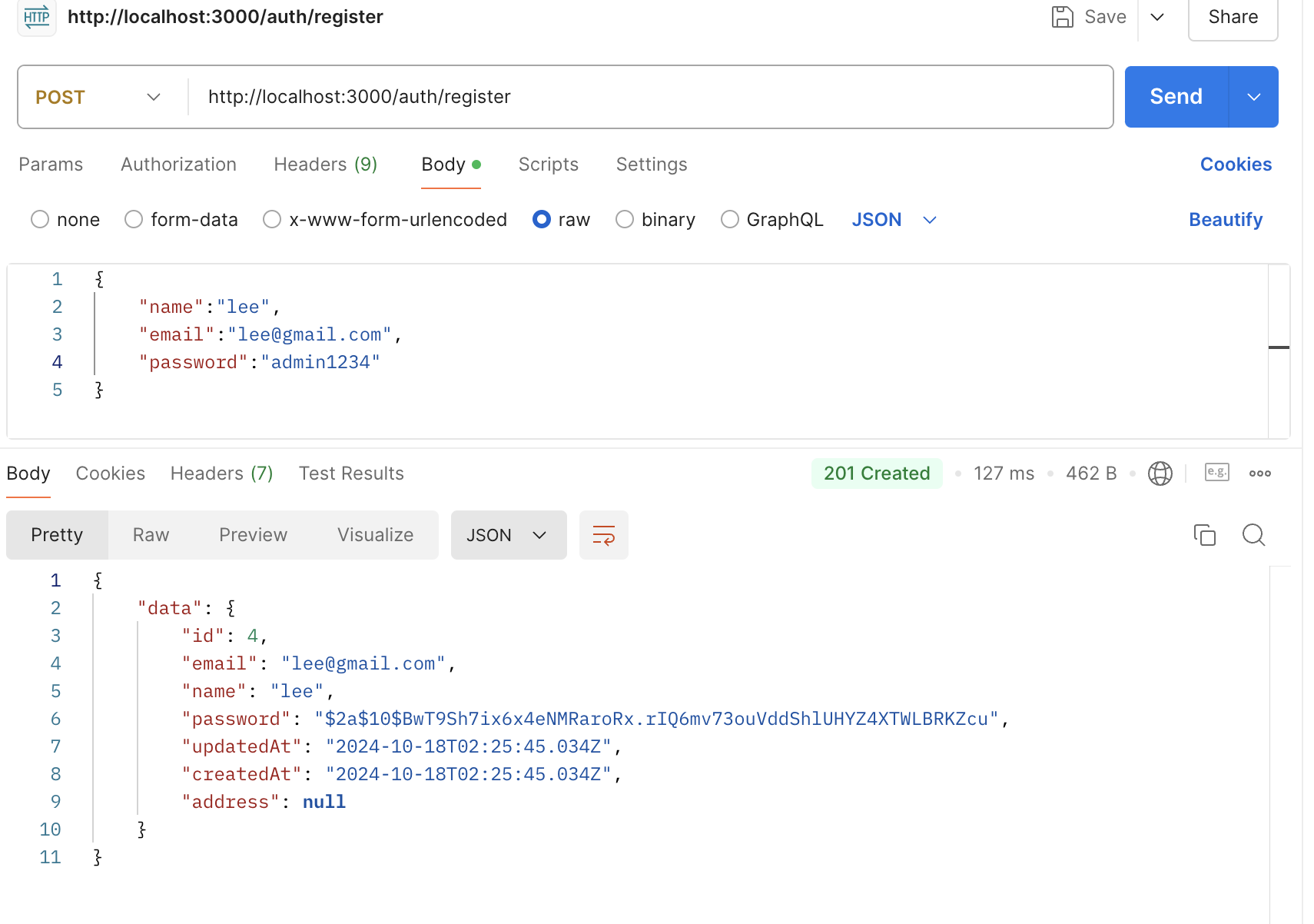 그러면 http://localhost:3000/auth/register 로 POST 요청을 하면 된다.