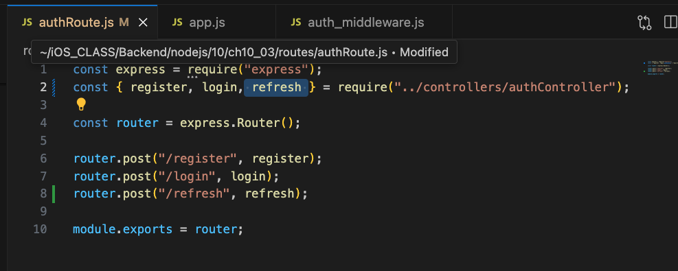 authRoute.js 에 가서 객체 안에 refresh 를 넣어주고, 라우터 작업도 해준다.