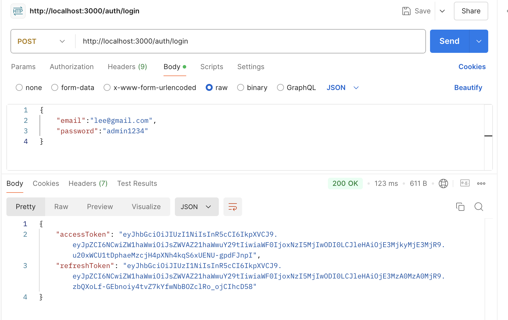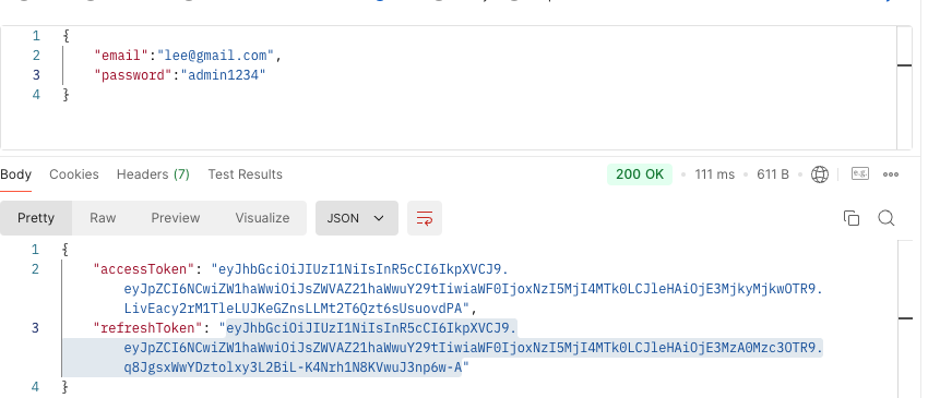 아래와 같이 성공적으로 accessToken, refreshToken이 나오는 것을 볼 수 있다.