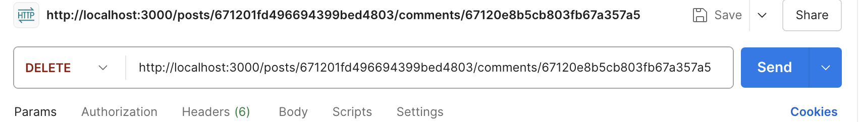 /DELETE http://localhost:3000/posts/671201fd496694399bed4803/comments/67120e8b5cb803fb67a357a5