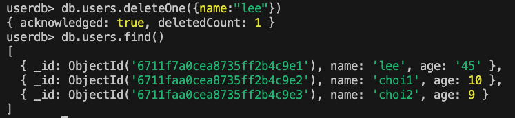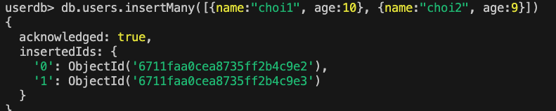db.users.insertMany([{name:"choi1", age:10}, {name:"choi2", age:9}])