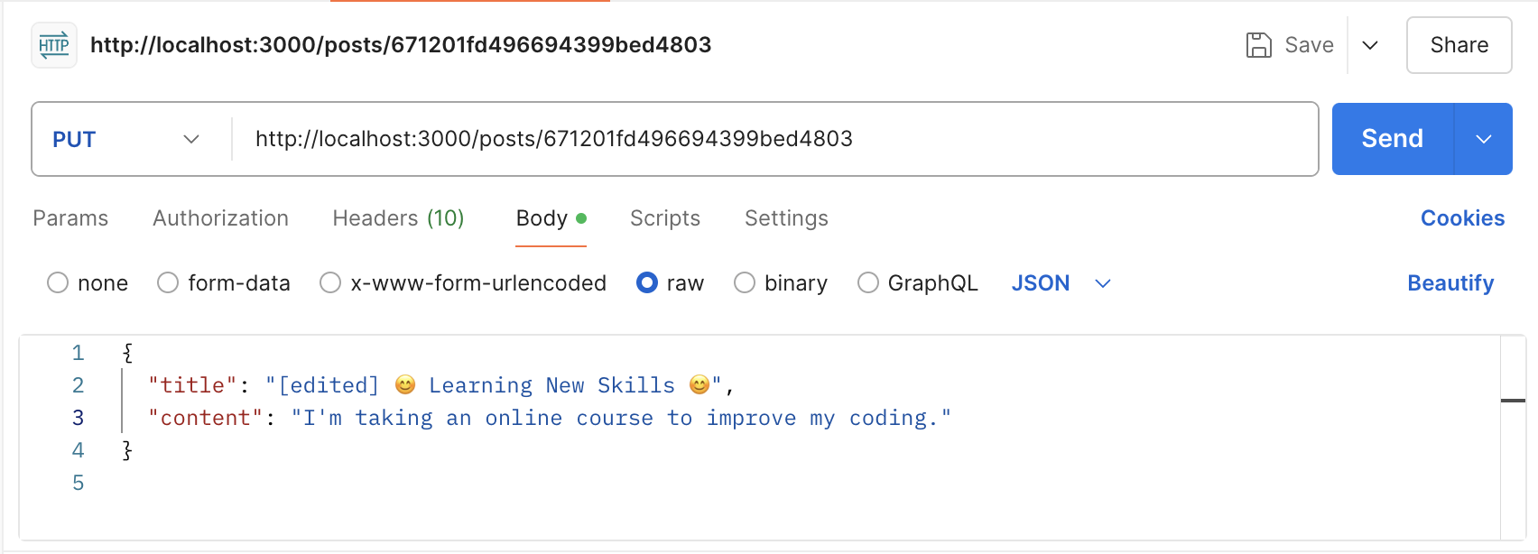 따라서 포스트맨에서 테스트를 할 때, 몽고 DB에서 데이터를 POST 할 때에 생성해준 id값을 붙여넣는다.