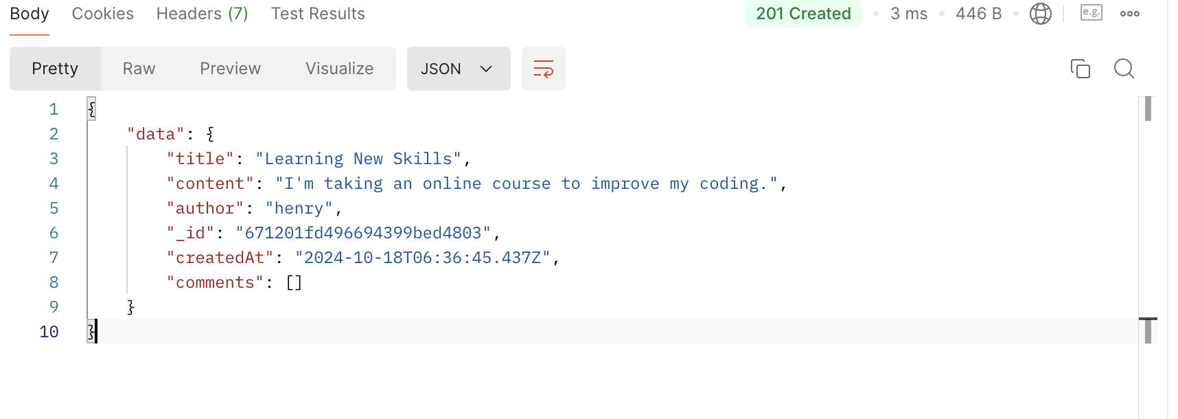 - 예제: 코드에서는 comments 배열에 새로운 댓글을 추가하고 있다. 즉, 해당 포스트의 comments 필드에 comment와 author 정보를 담은 객체를 추가하게 된다.