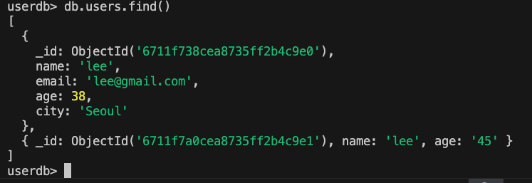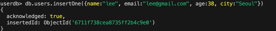 db.users.insertOne({name:"lee", email:"lee@gmail.com", age:38, city:"Seoul"})