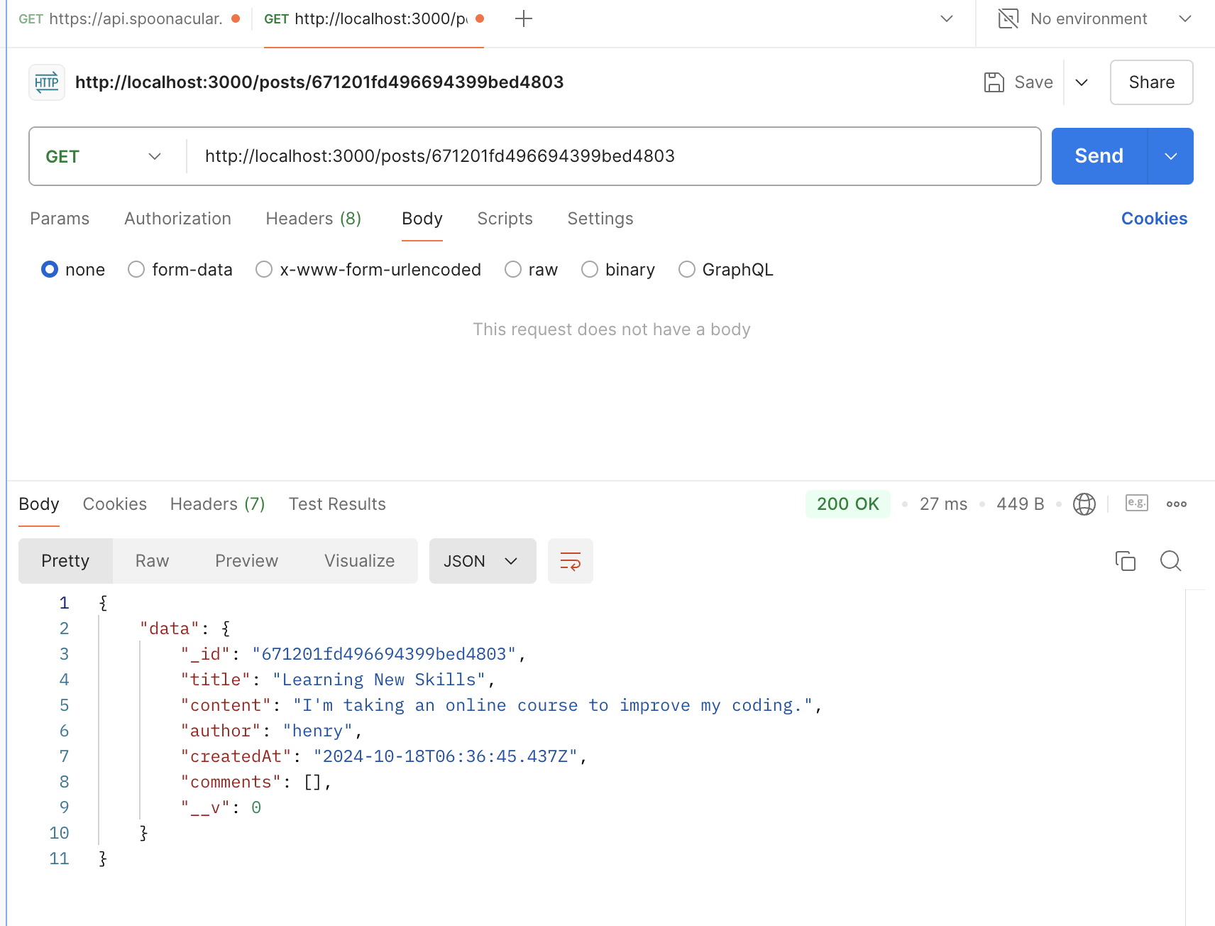 여기서는 _id 값이 671201fd496694399bed4803 이므로, GET 요청 엔드포인트로는 id값의 위치에 이 값을 넣어서 요청한다.