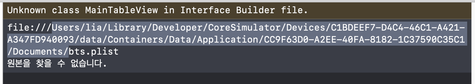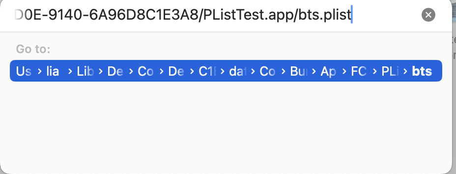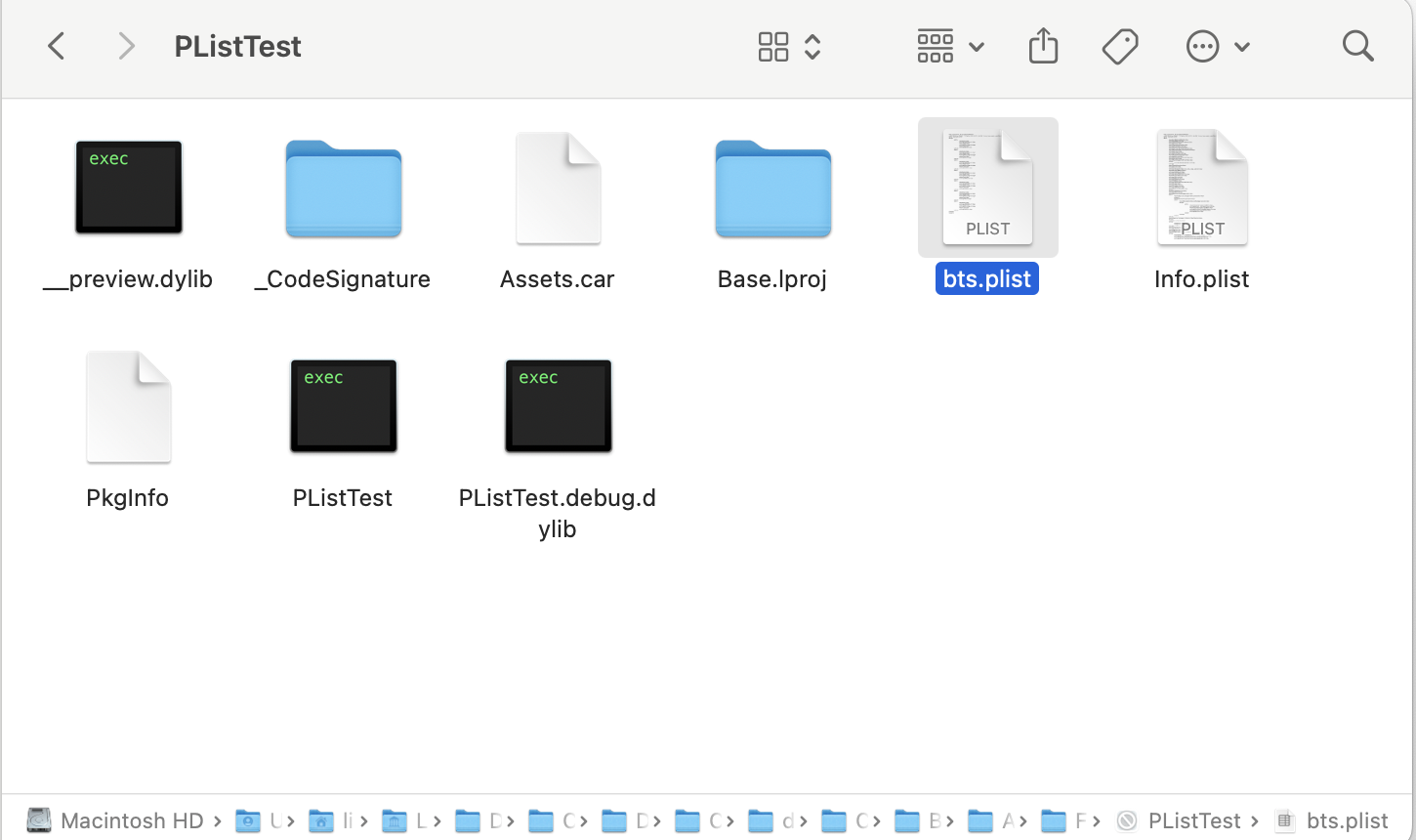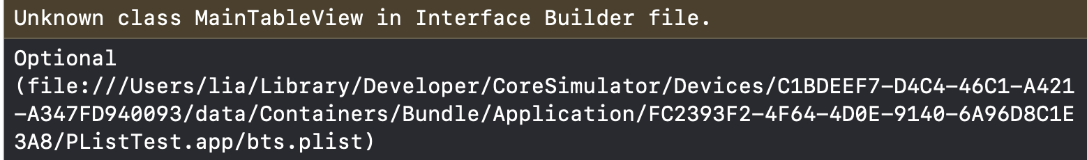 Optional(file:///Users/lia/Library/Developer/CoreSimulator/Devices/C1BDEEF7-D4C4-46C1-A421-A347FD940093/data/Containers/Bundle/Application/FC2393F2-4F64-4D0E-9140-6A96D8C1E3A8/PListTest.app/bts.plist)