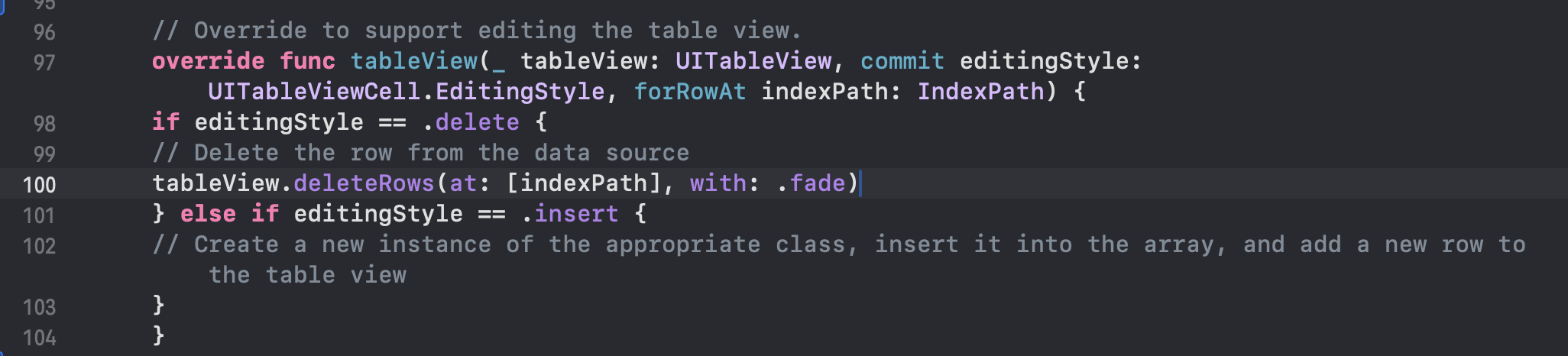 여기에서, 데이터와 테이블 row 수가 안맞으면 앱이 터지기 때문에 시뮬레이션 뷰에서 데이터를 삭제하면, 실제 데이터도 삭제를 해주는 작업을 여기서도 해준다.