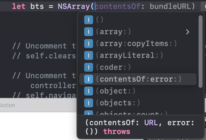다시 돌아가서 일전에 얘기했던 NSArray를 쓸건데, 보면 throws가 있다 -> 예외처리를 해줘야한다. (try-catch)
