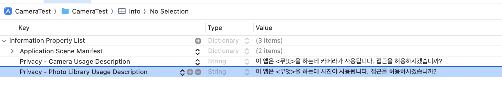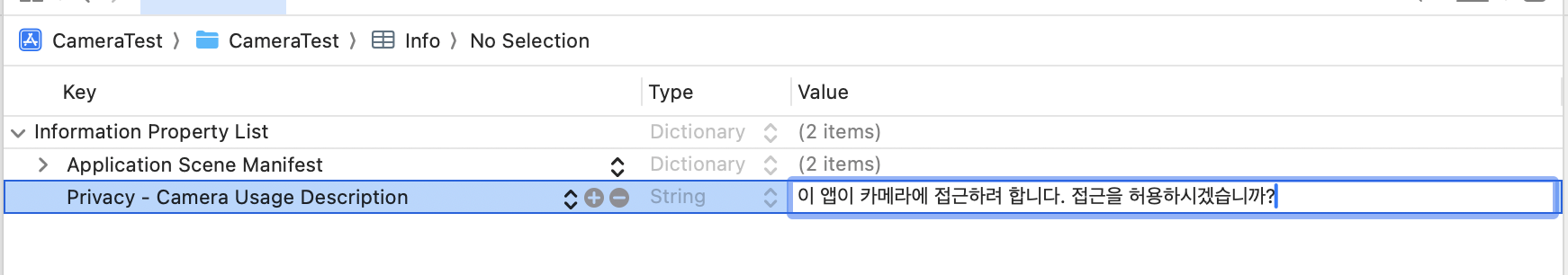 아래와 같이 Application Scene Manifest 아래에 Privacy - Camera Usage Description 옵션을 추가해준다.