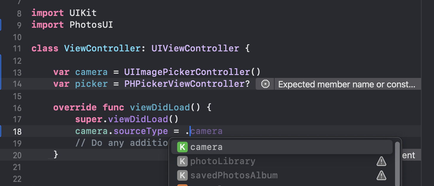 UIImagePickerController()의 객체인 camera의 sourceType은 .camera만 가능하고, 나머지 기능들은 deprecated된 것을 알 수 있다.