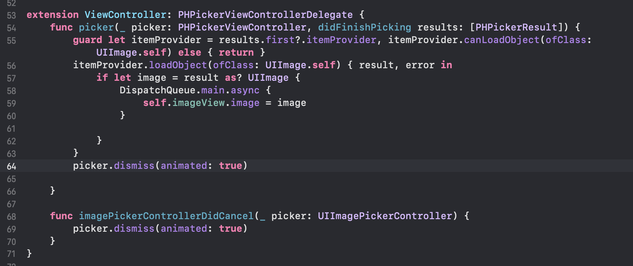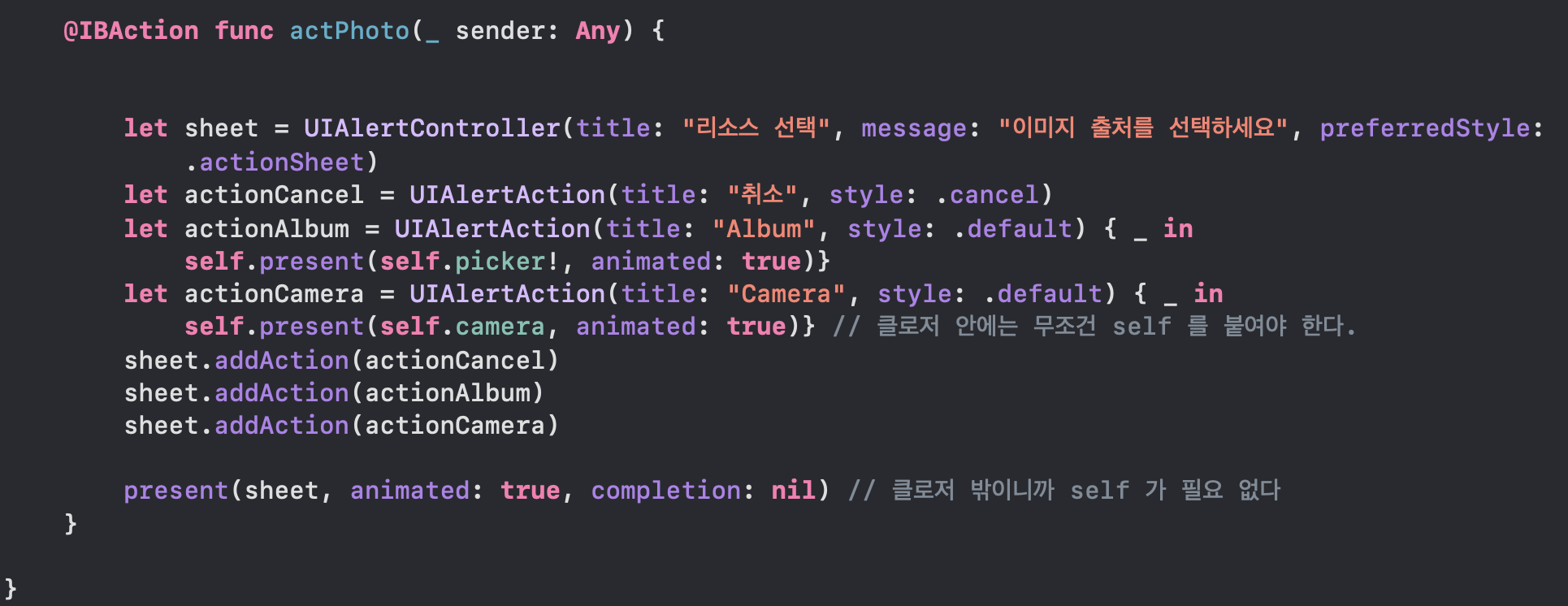 아, 그리고 picker.dismiss(animated:true) 위치를 위에 넣어주어야 취소 버튼 동작이 잘한다.